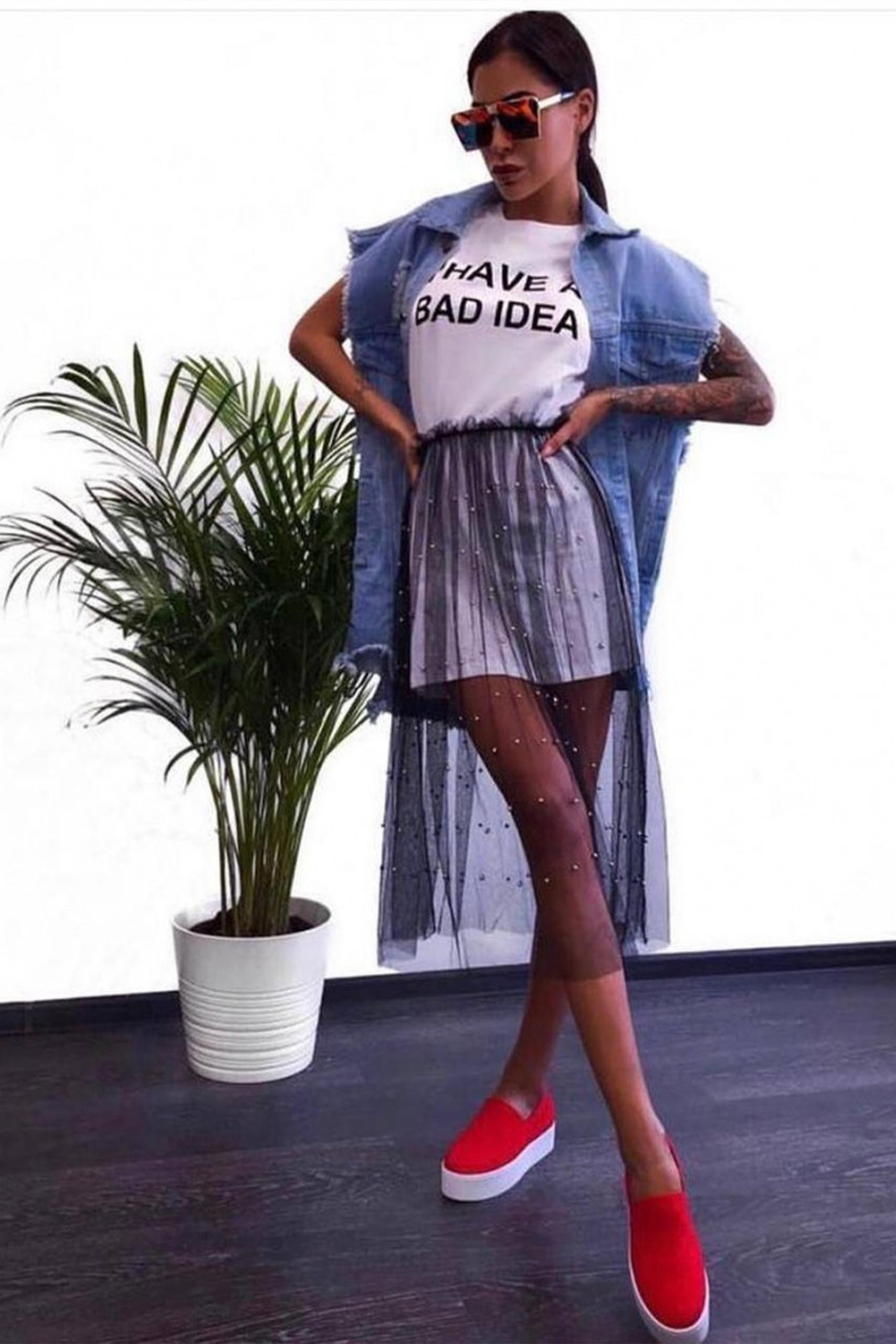 Mix n match σετ με μακό μίνι φόρεμα have a bad idea print σε δύο αποχρώσεις και τούλινη διάφανη φούστα με faux πέρλες.