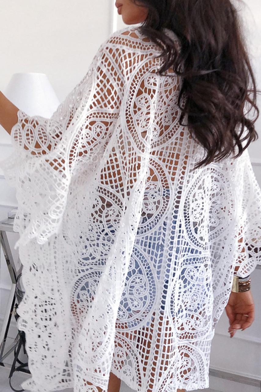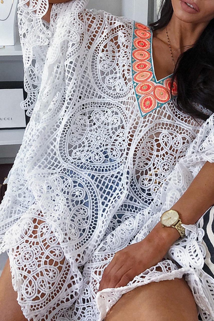 Embroidered πόντσο φόρεμα παραλίας με 3/4 μανίκια και σε λευκό χρώμα και V neck με φλούο λεπτομέρεια.