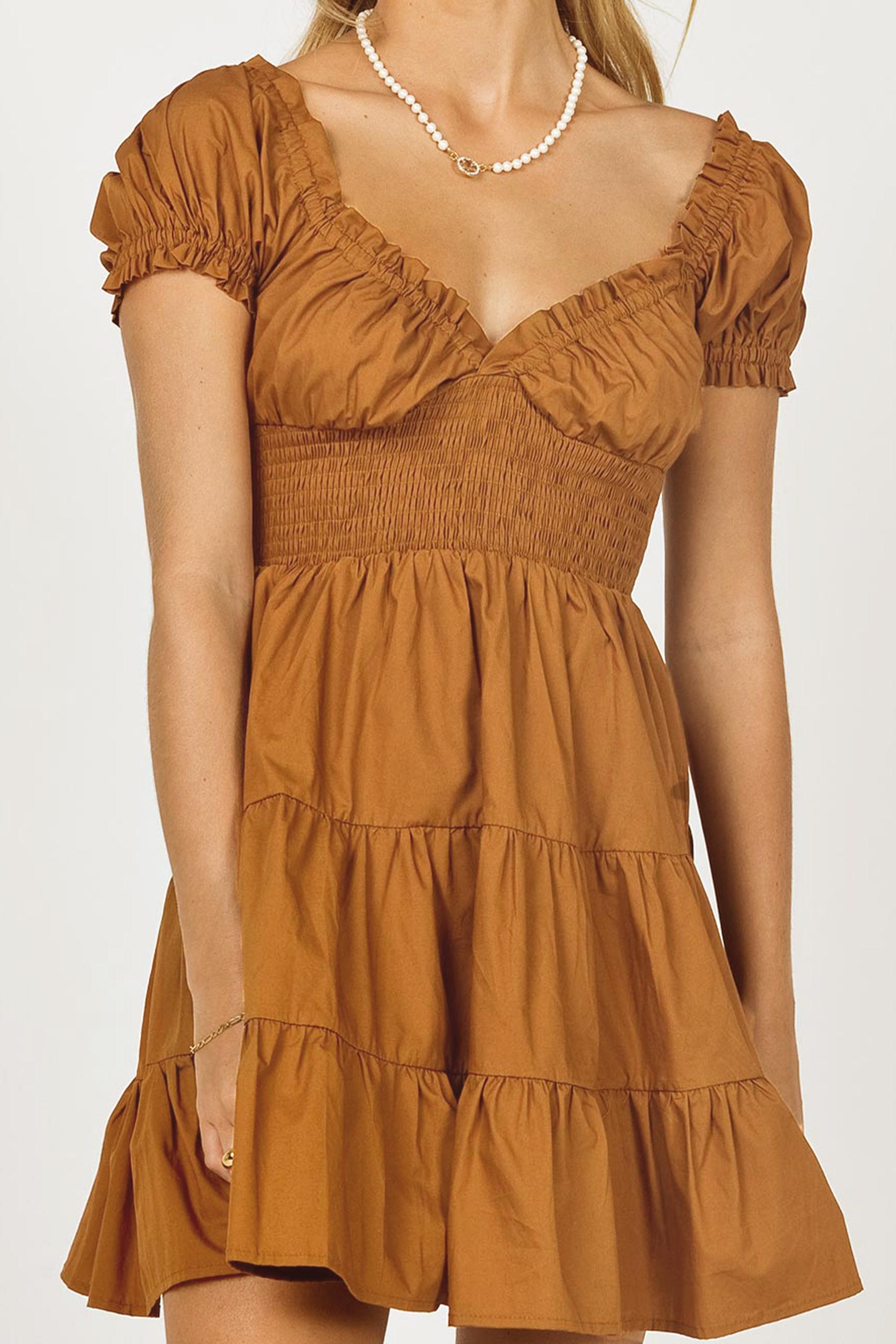 ‘Εξωμο φόρεμα με βολάν σε τρεις αποχρώσεις με σφηκοφωλιά στη μέση και φούστα με πτυχές στο κάτω μέρος.