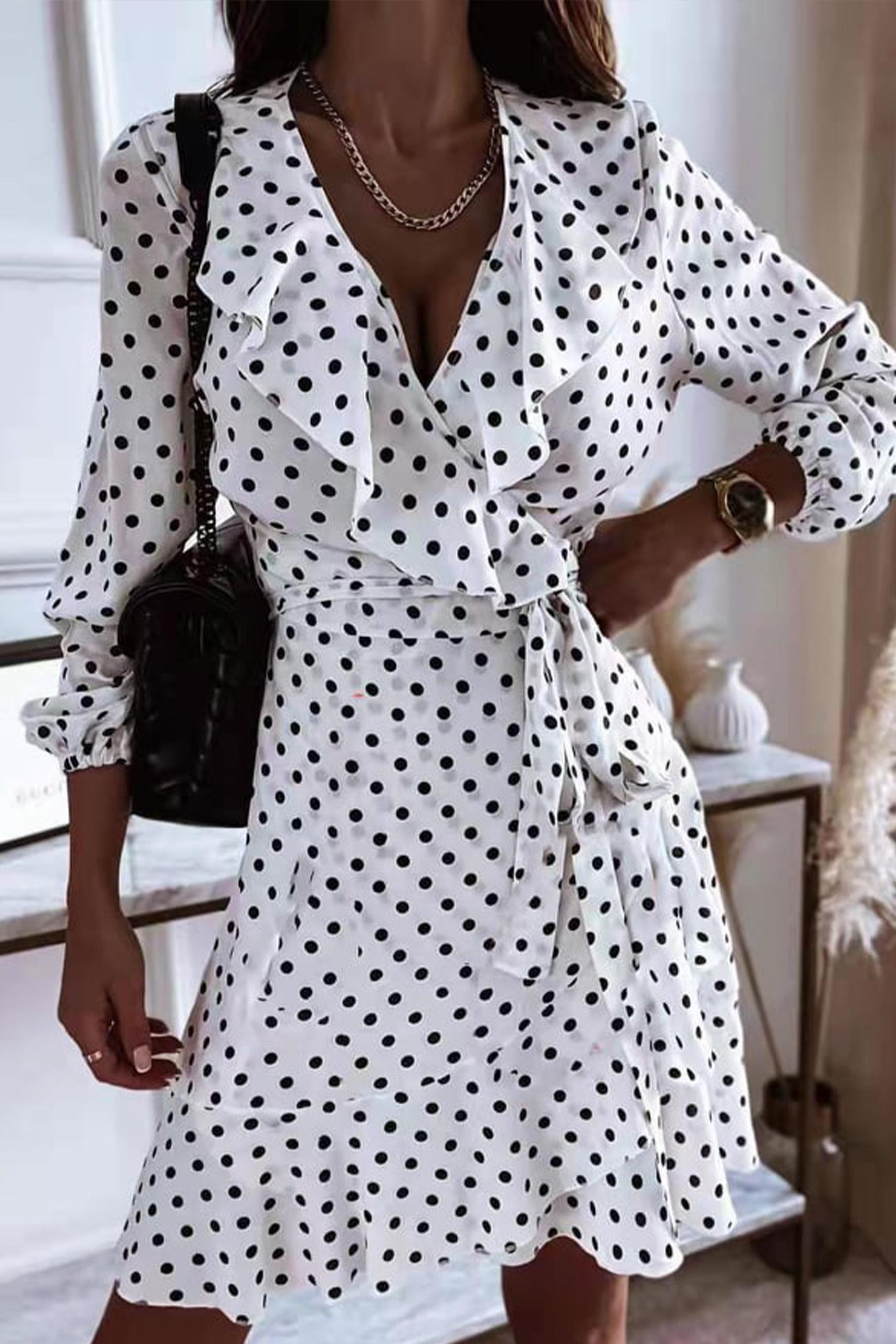 Wrap V neck φόρεμα με βολάν σε τρεις αποχρώσεις και πουά pattern.
