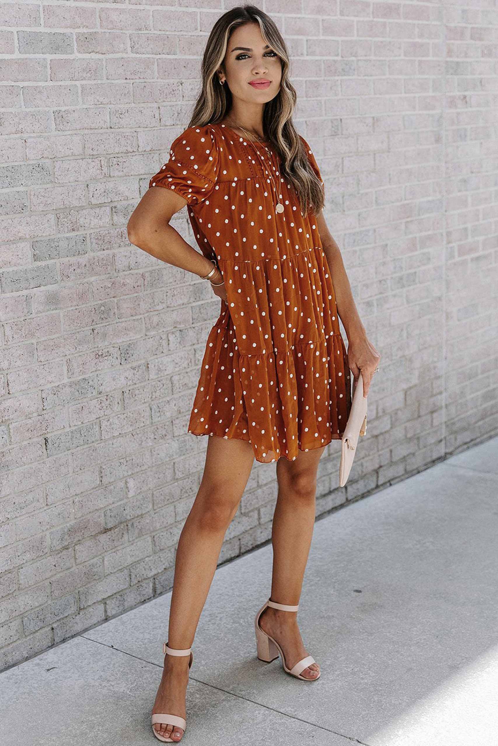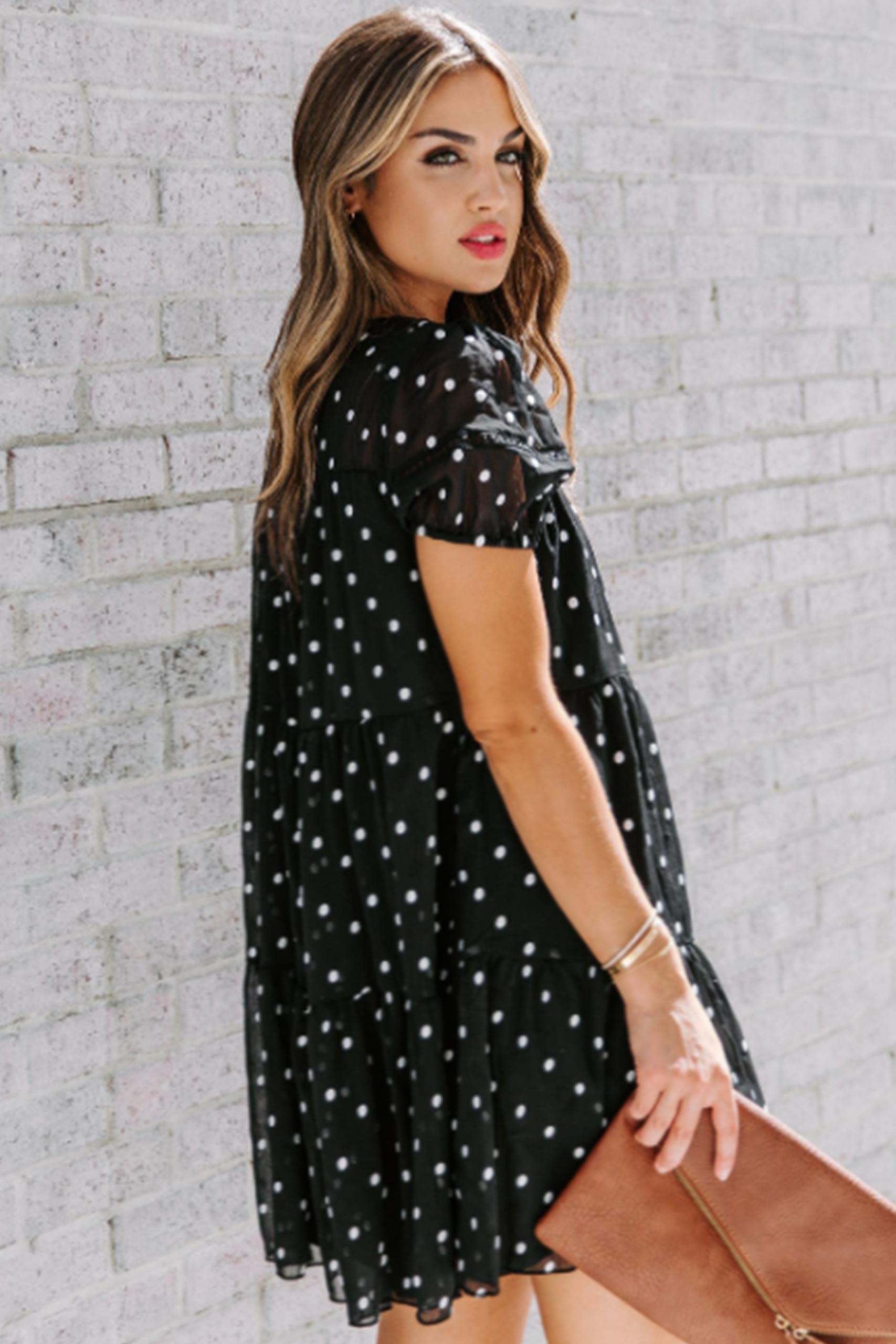 Peplum polkadot ρομαντικό και girly πουά φόρεμα με μεγάλα βολάν περιμετρικά σε δύο αποχρώσεις.