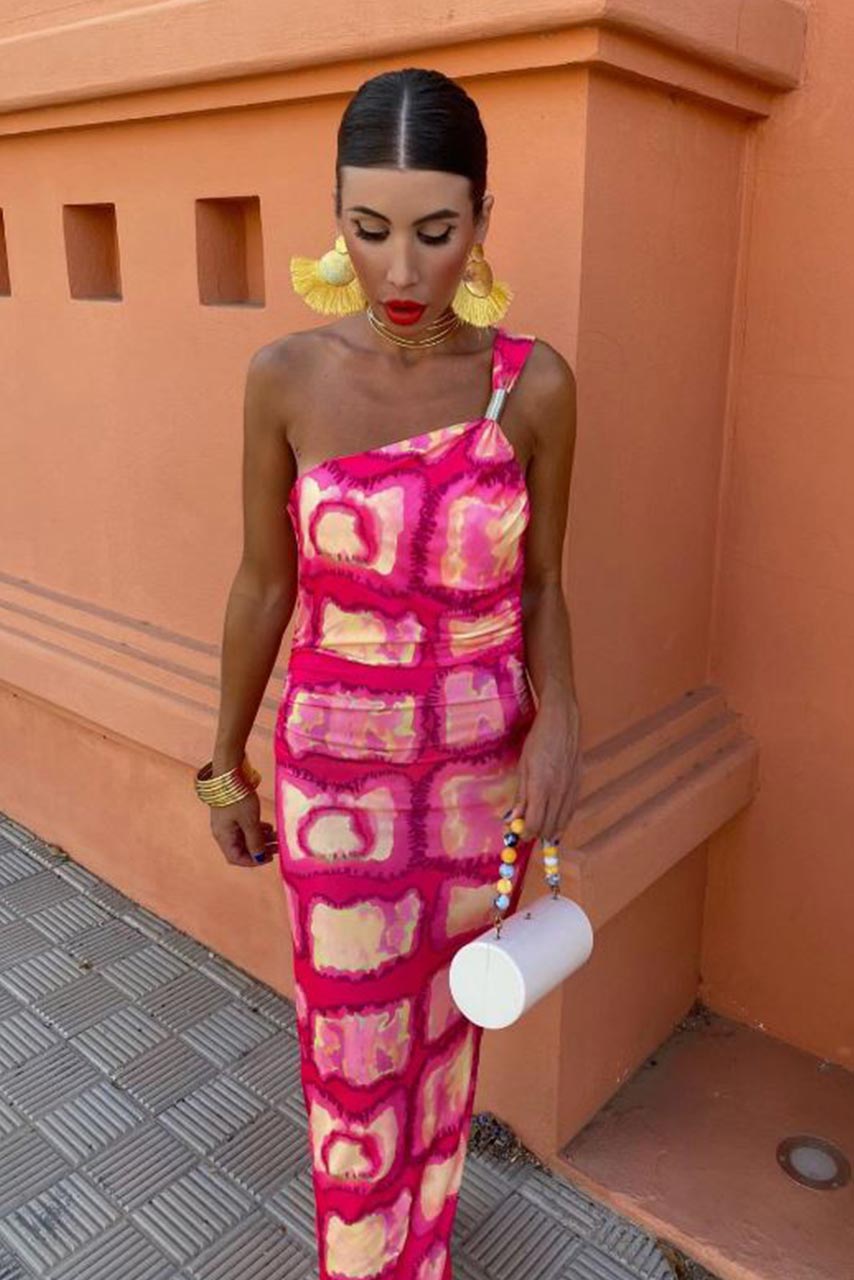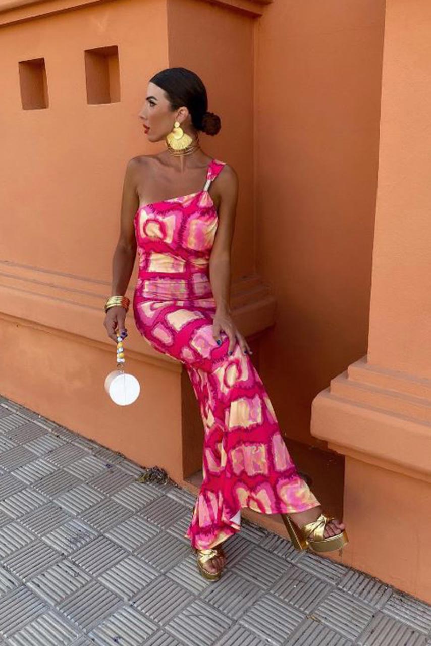 Εμπριμέ one shoulder μακρύ φόρεμα ροζ