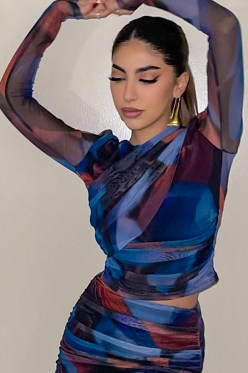 Πολύχρωμο τούλινο σετάκι. Το τοπάκι είναι μακρυμάνικο και crop top και η φούστα ψηλόμεση με ελαστικότητα στην μέση. Κατάλληλο για να σαγηνεύσεις στις εξόδους σου.