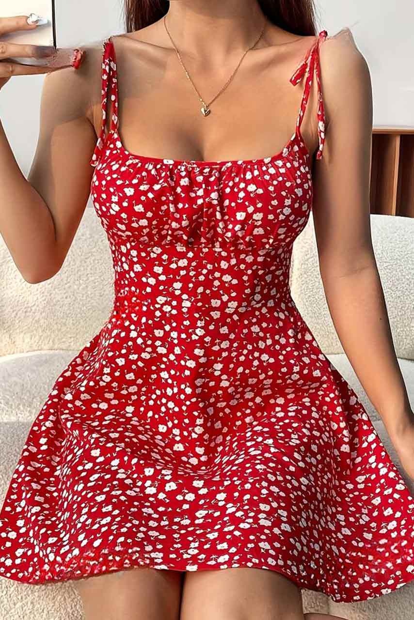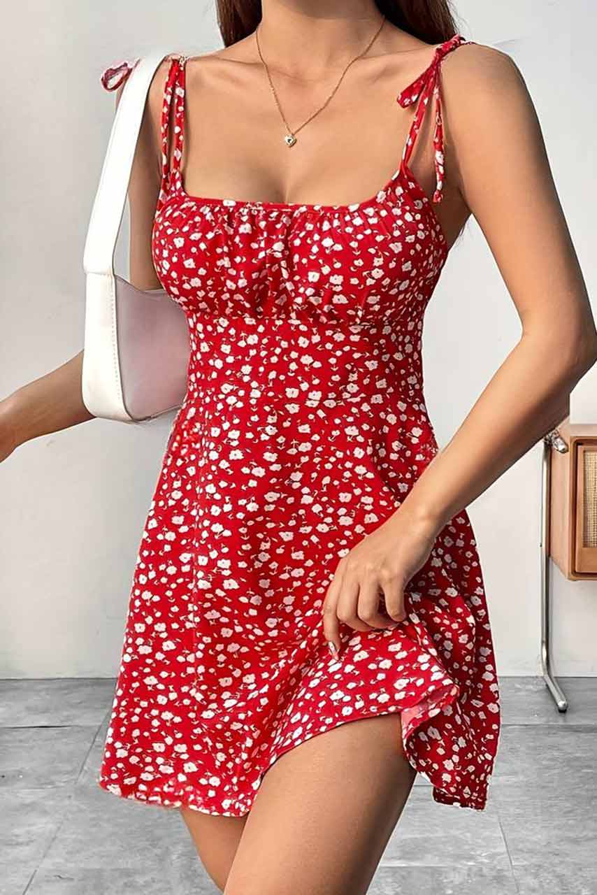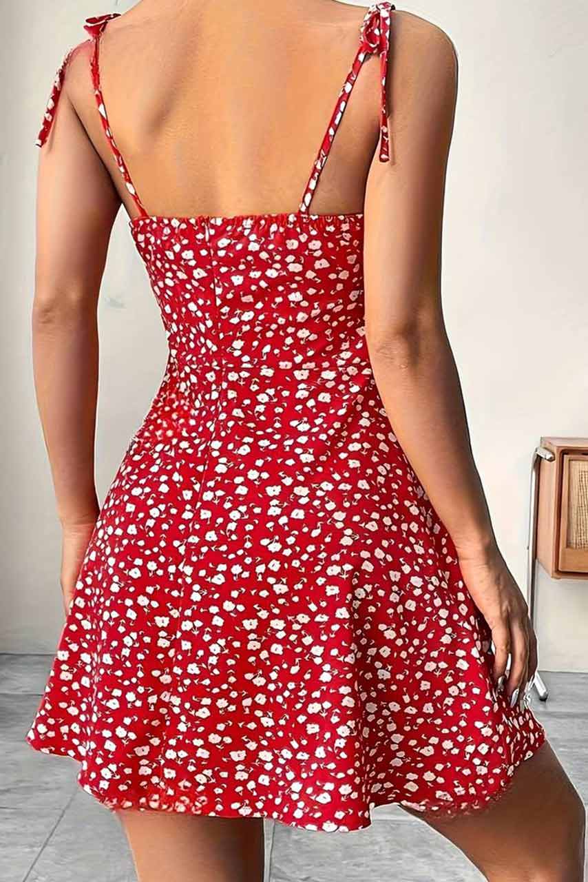 Κόκκινο μίνι φόρεμα με μικρά λευκά λουλουδάκια. Οι τιράντες είναι δετές και διαθέτει φερμουάρ στην πλάτη. Η μίνι αυτή αέρινη δημιουργία θα σας χαρίσει άνεση και στυλ.