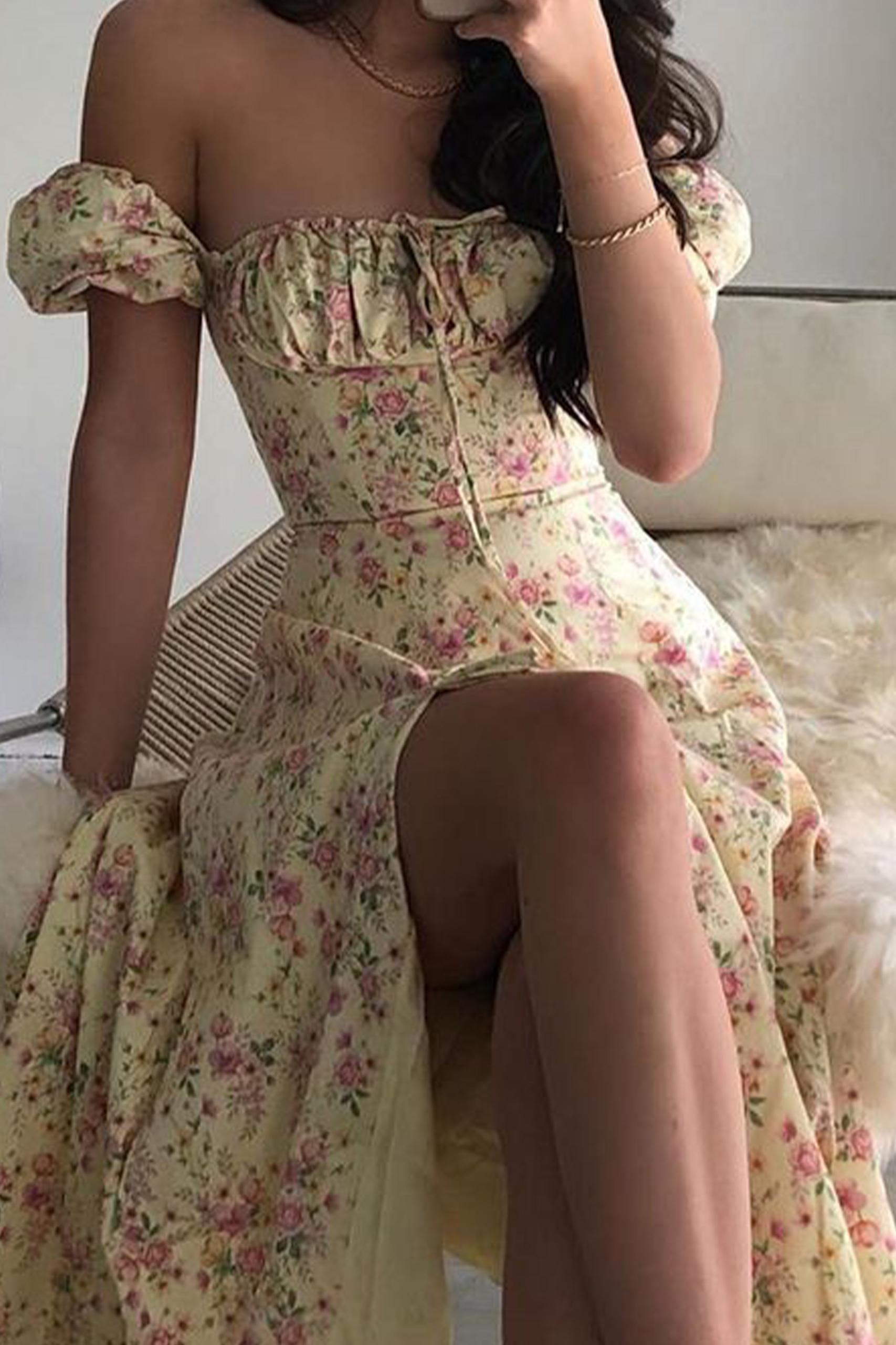 Romantic girly έξωμο maxi φόρεμα σε δύο pastel αποχρώσεις με έντονη σφηκοφωλιά στο στήθος και κοντό μανίκι με σούρες.