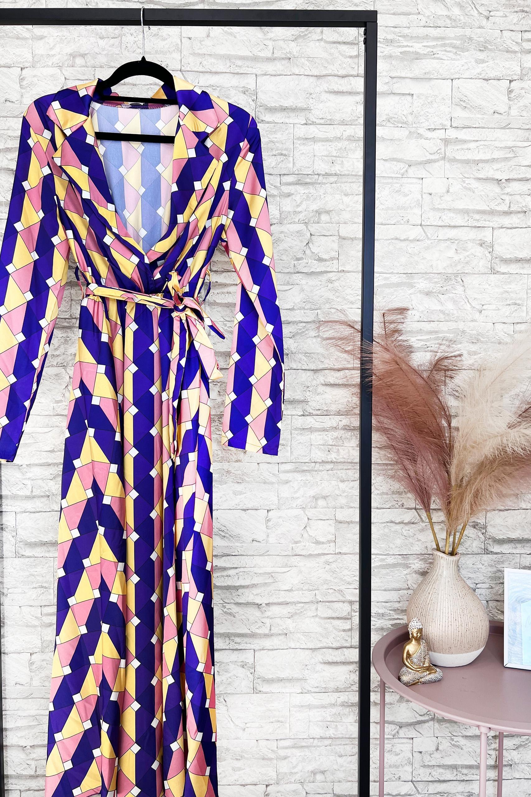 Retro printed maxi dress πολύχρωμο φόρεμα 70s inspired με έντονο σχέδιο και μεγάλο γιακά.