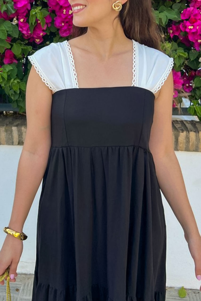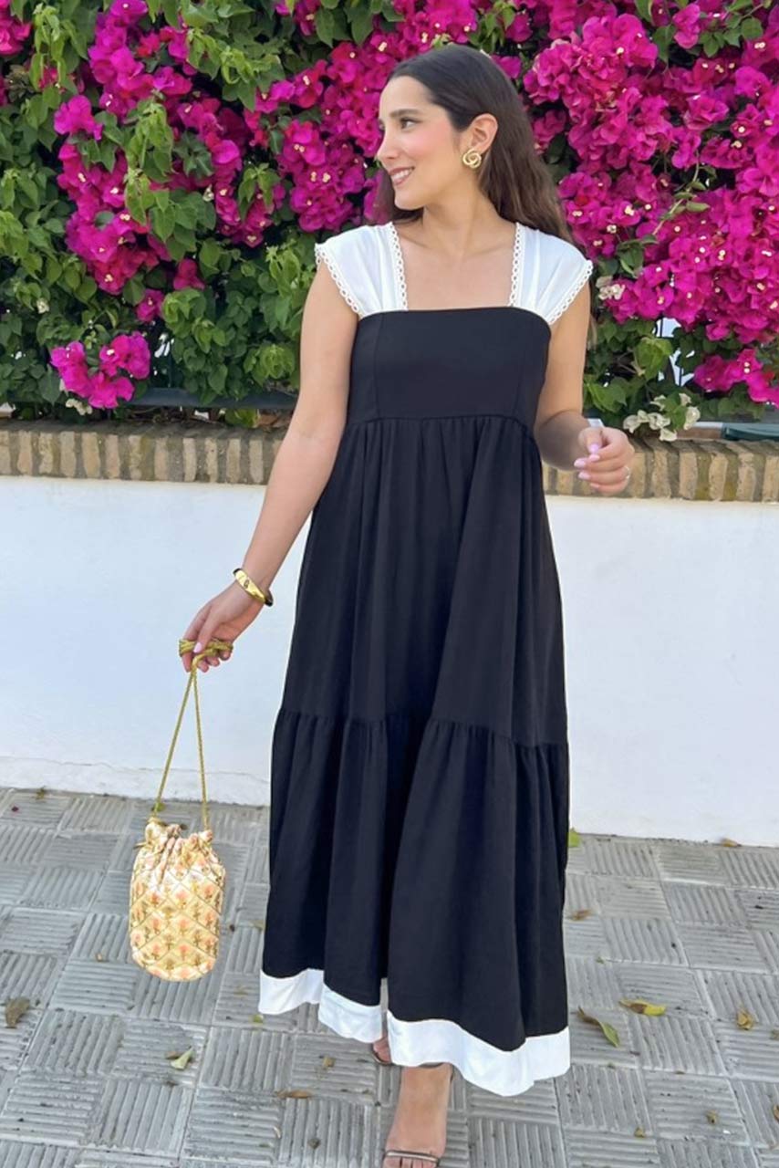 Ασπρόμαυρο μακρύ φόρεμα με σταθερές τιράντες τύπου peasant και ρομαντικό βολάν κόψιμο κατά μήκος.