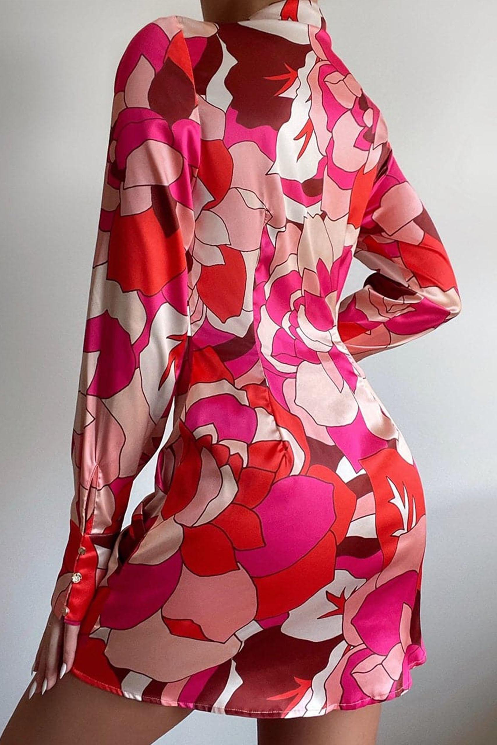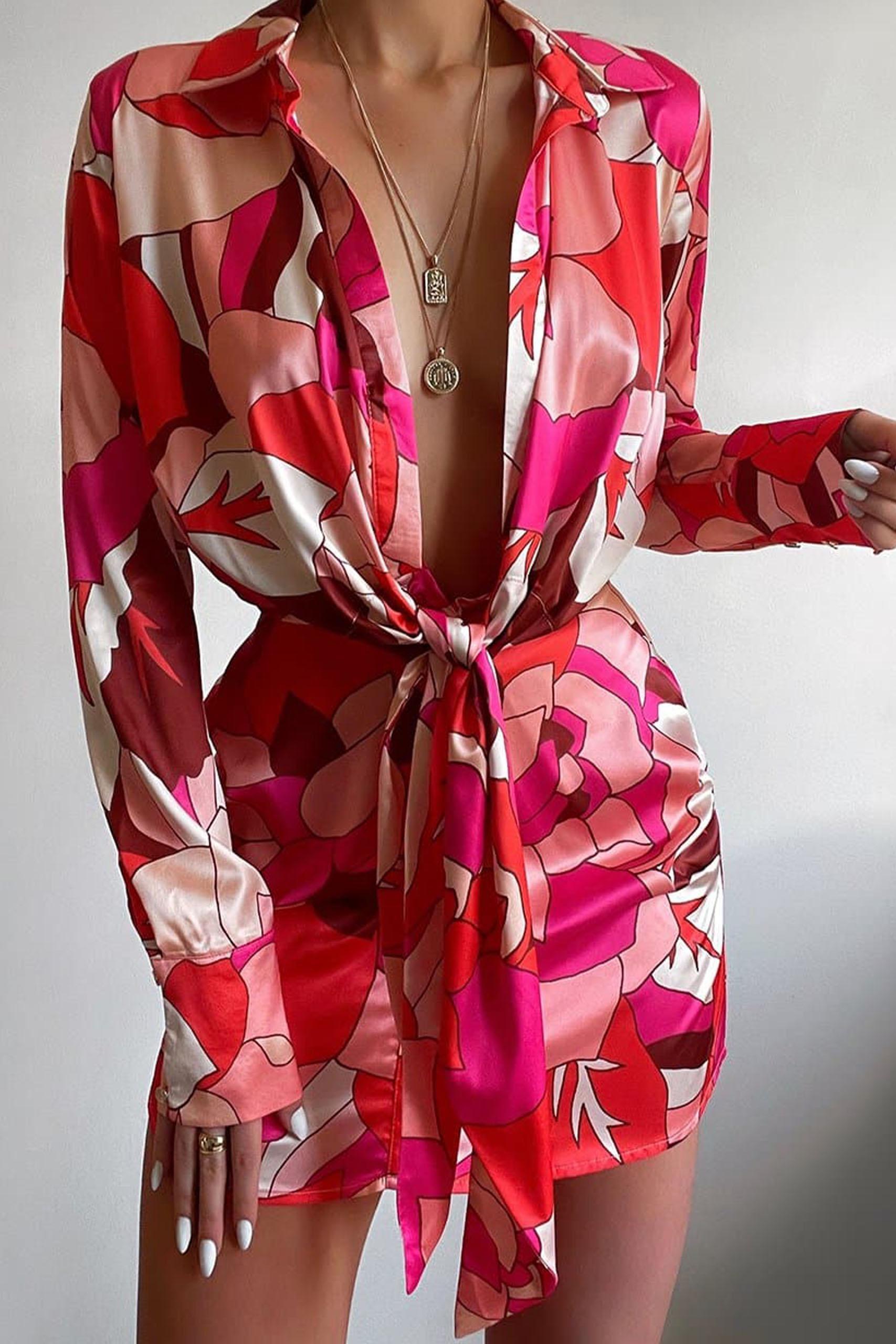 Satin natural front tie φόρεμα μίνι με μεγάλο V neck σε πολύχρωμο pattern με δέσιμο μπροστά.