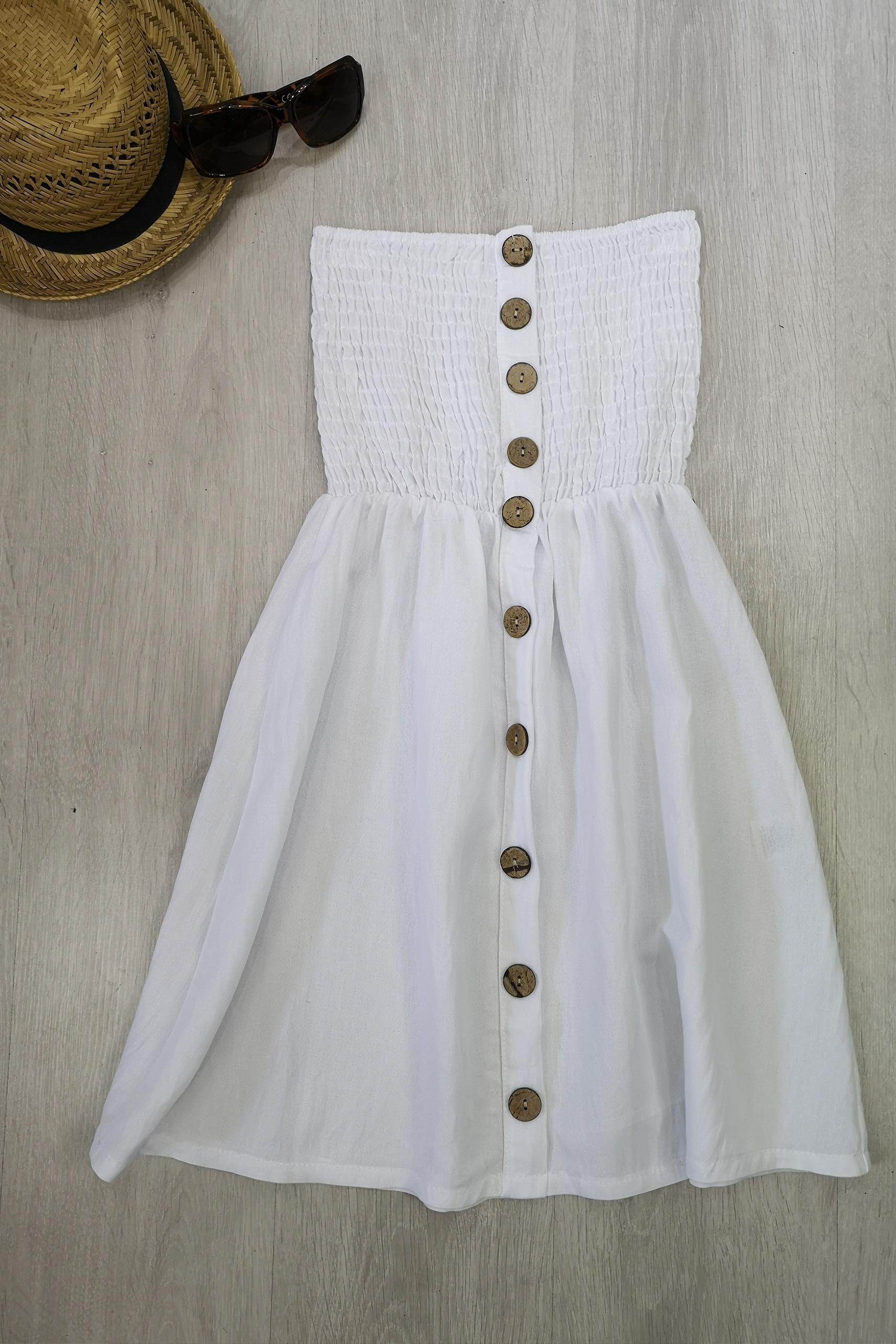 Λινό λευκό στράπλες φόρεμα με διακοσμητικά κουμπιά.