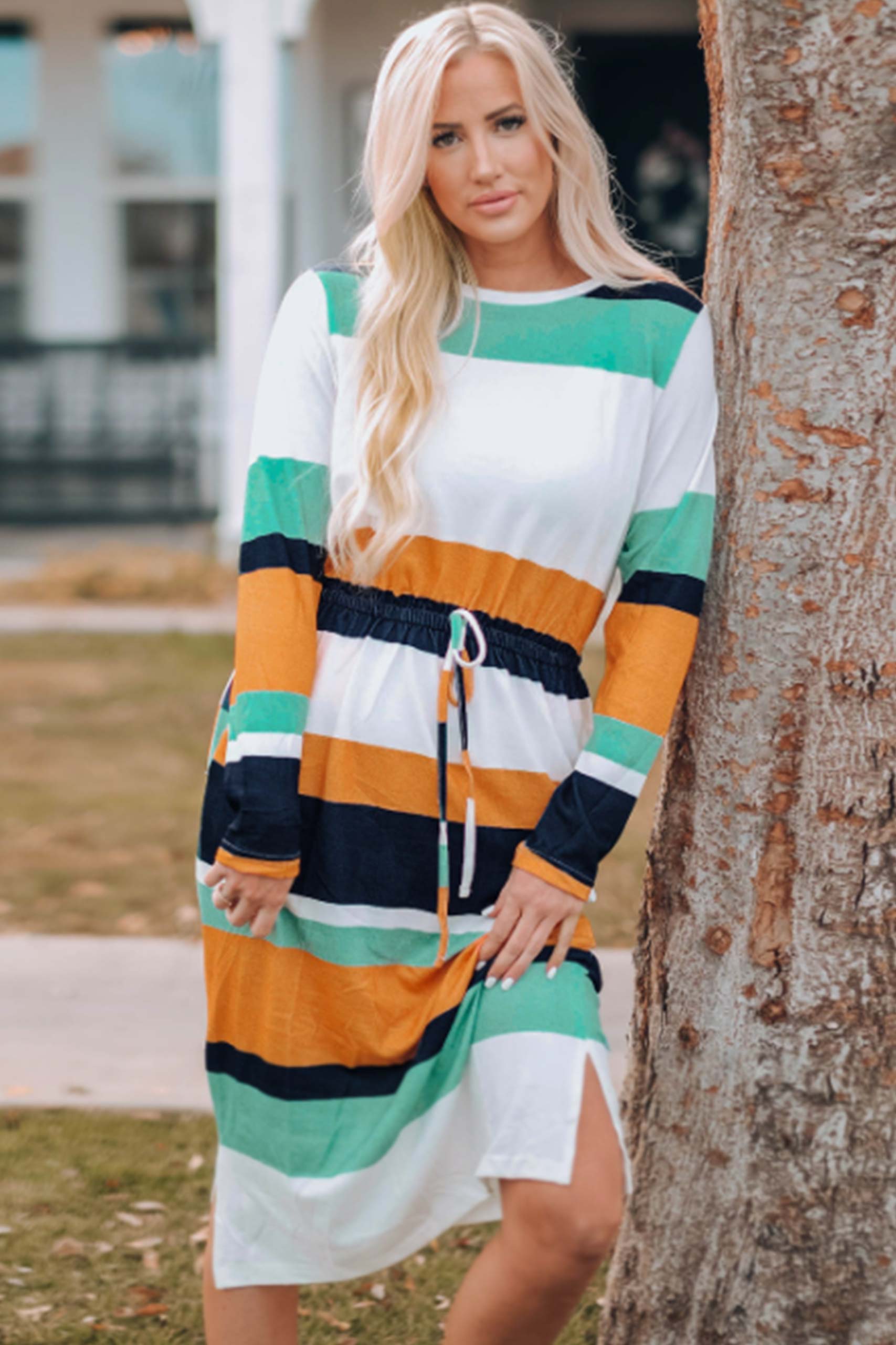 Loose ριγέ πολύχρωμο φόρεμα με στρογγυλή λαιμόκοψη και κορδόνι στη μέση.