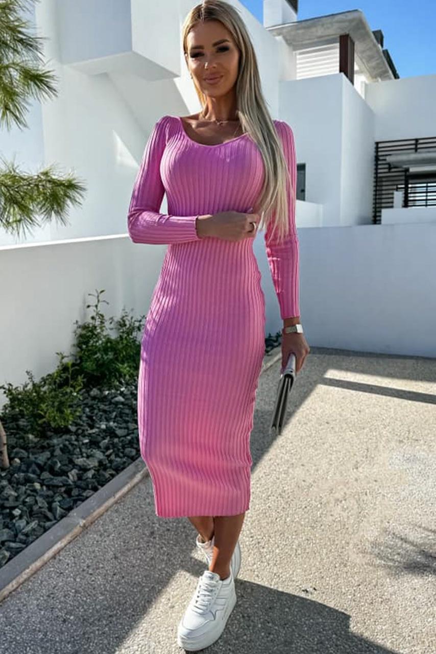 Casual chic V neck rib φόρεμα midi σε ροζ απόχρωση.