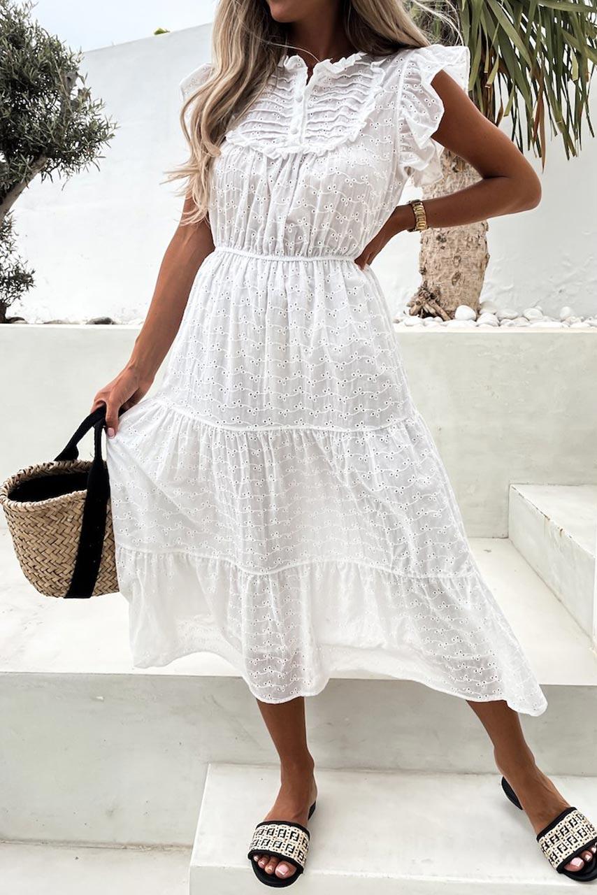 Vintage midi ημιδιάφανο φόρεμα σε λευκό χρώμα με βολάν και φραμπαλά στο μανίκι και στο πέτο και μικρή σούρα στη μέση.