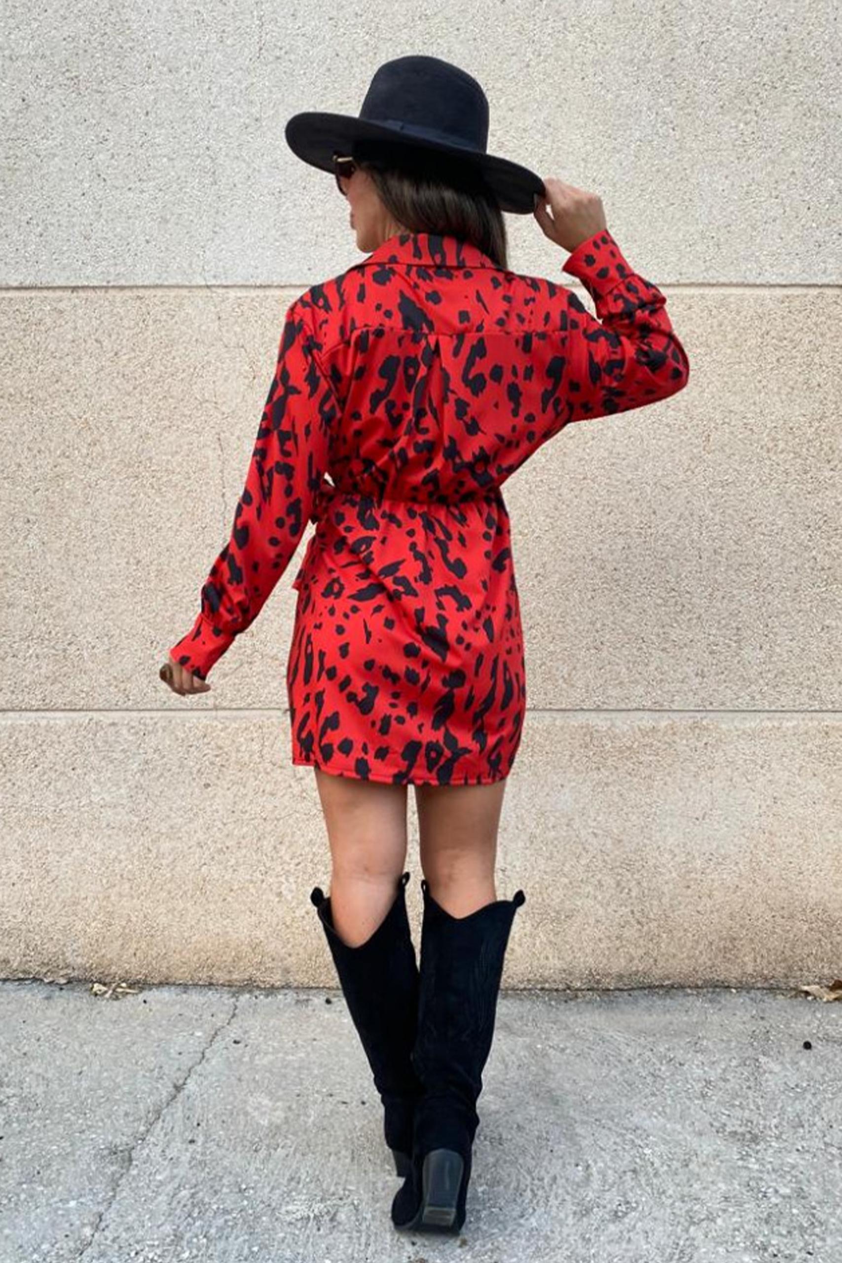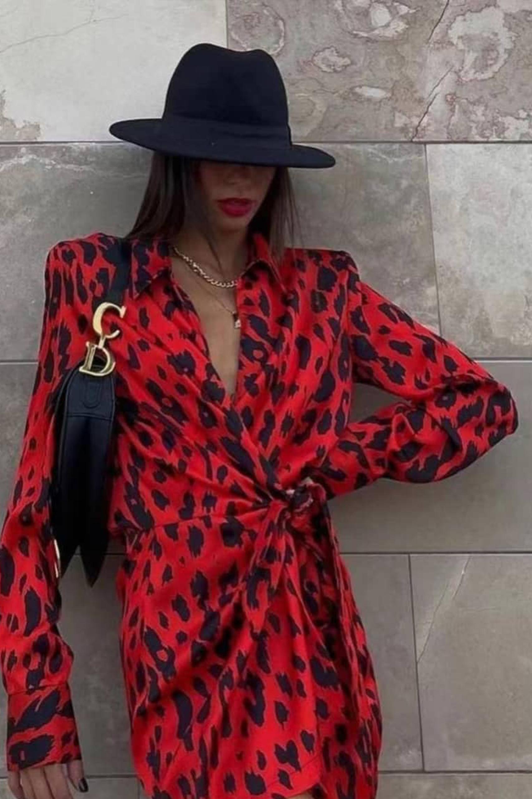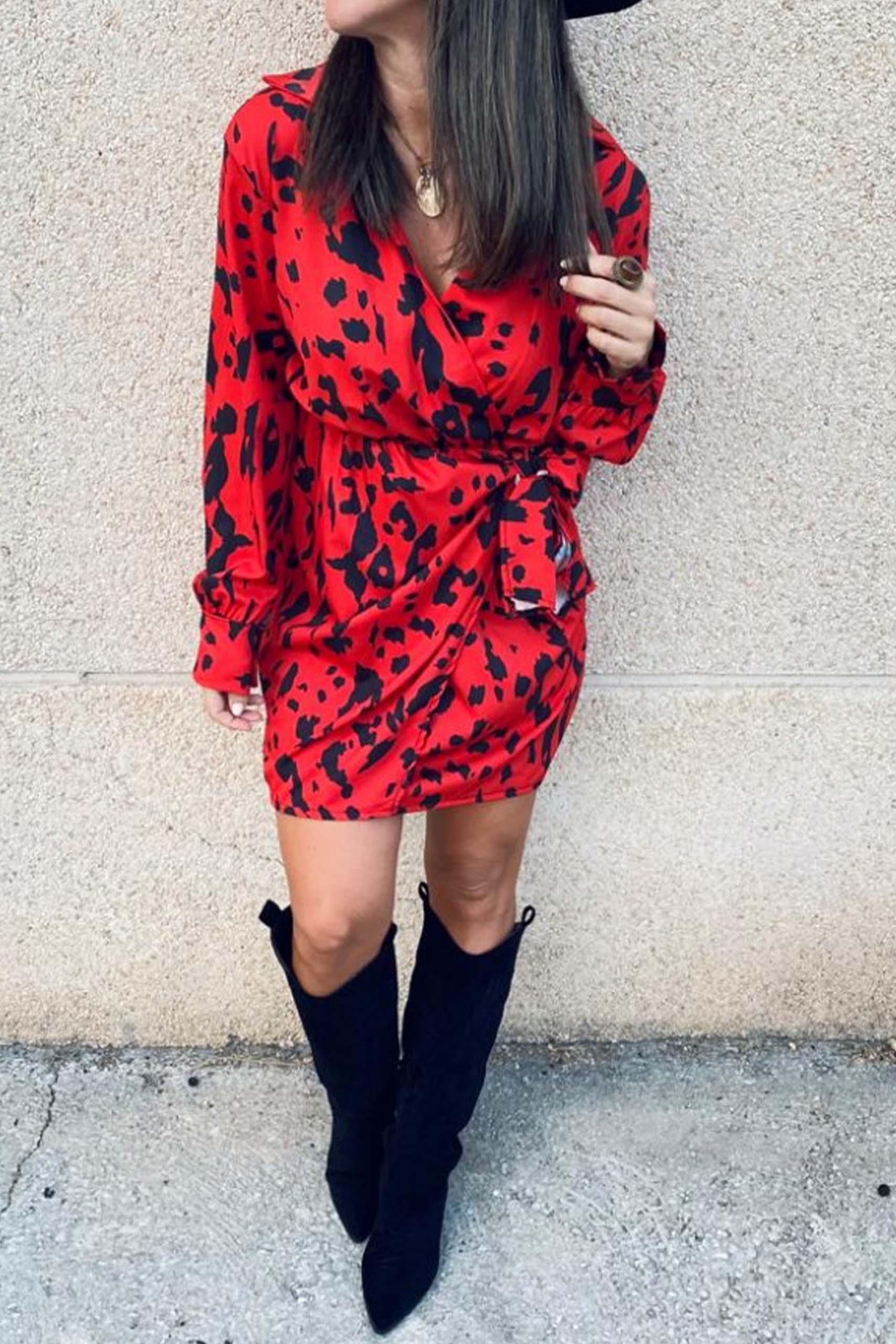 Printed wrap εμπριμέ κρουαζέ φόρεμα με δέσιμο στο πλάι σε έντονο κόκκινο χρώμα με μαύρες λεπτομέρειες.