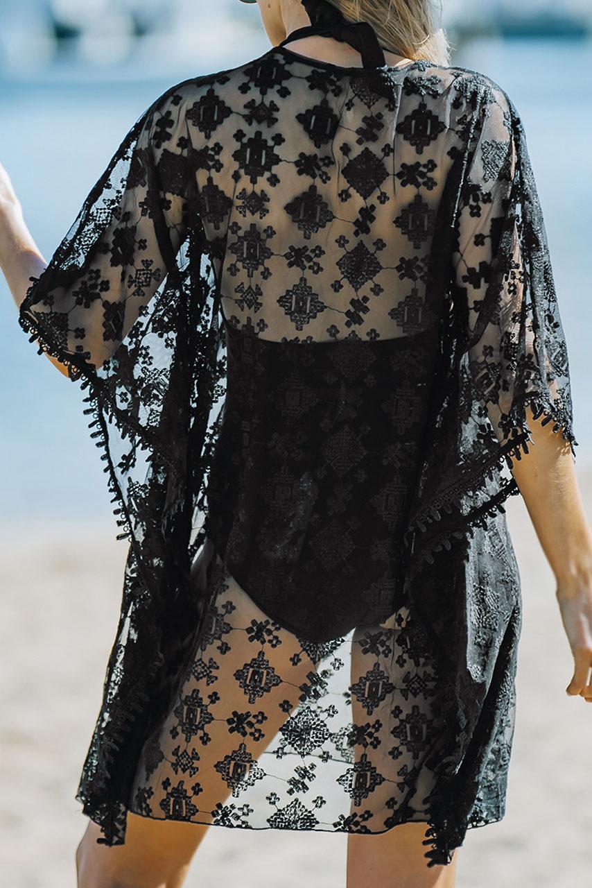 Glam hippie beachwear πόντσο μαύρο ημιδιάφανο με all over κέντημα και μικρά pom poms στα μανίκια.