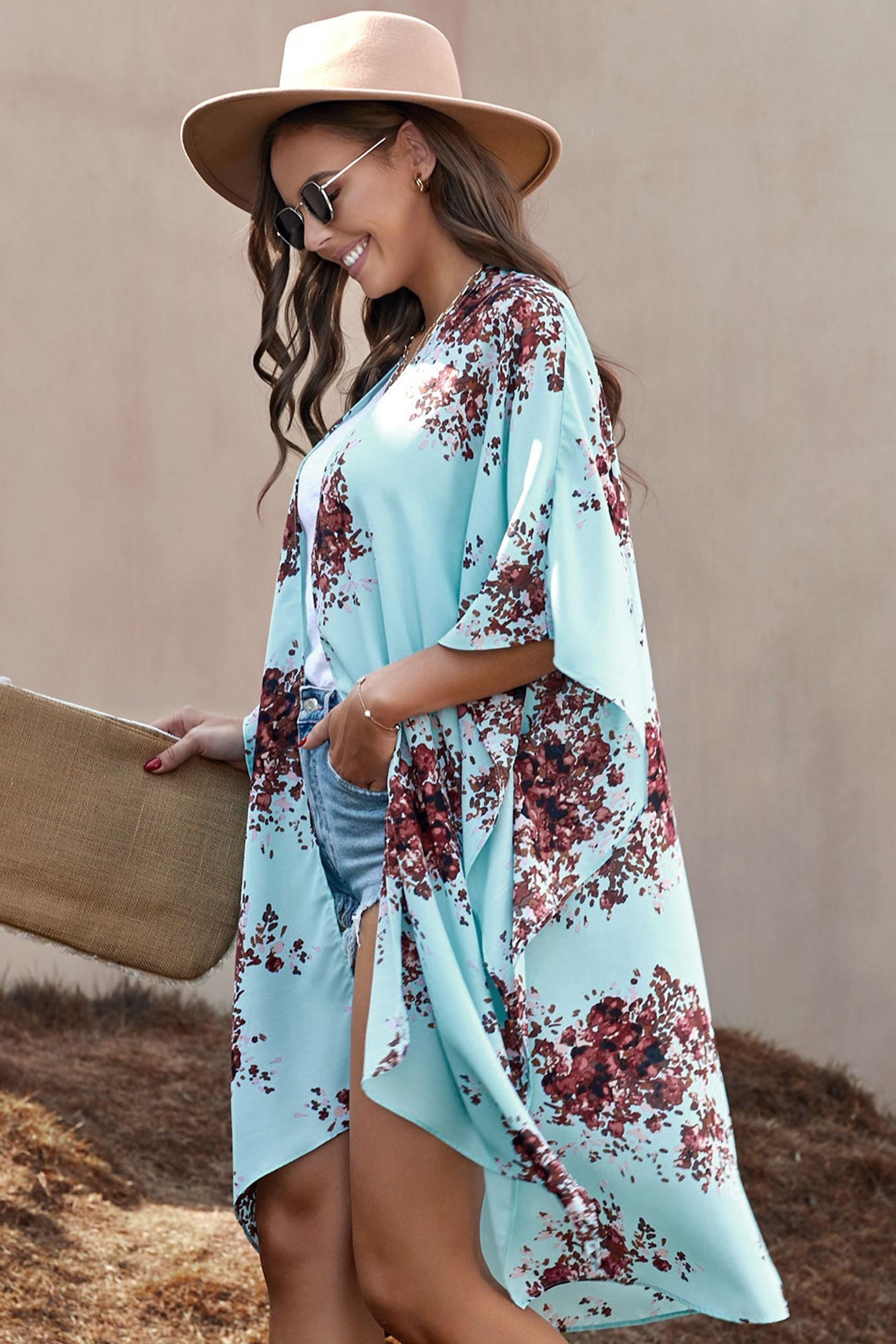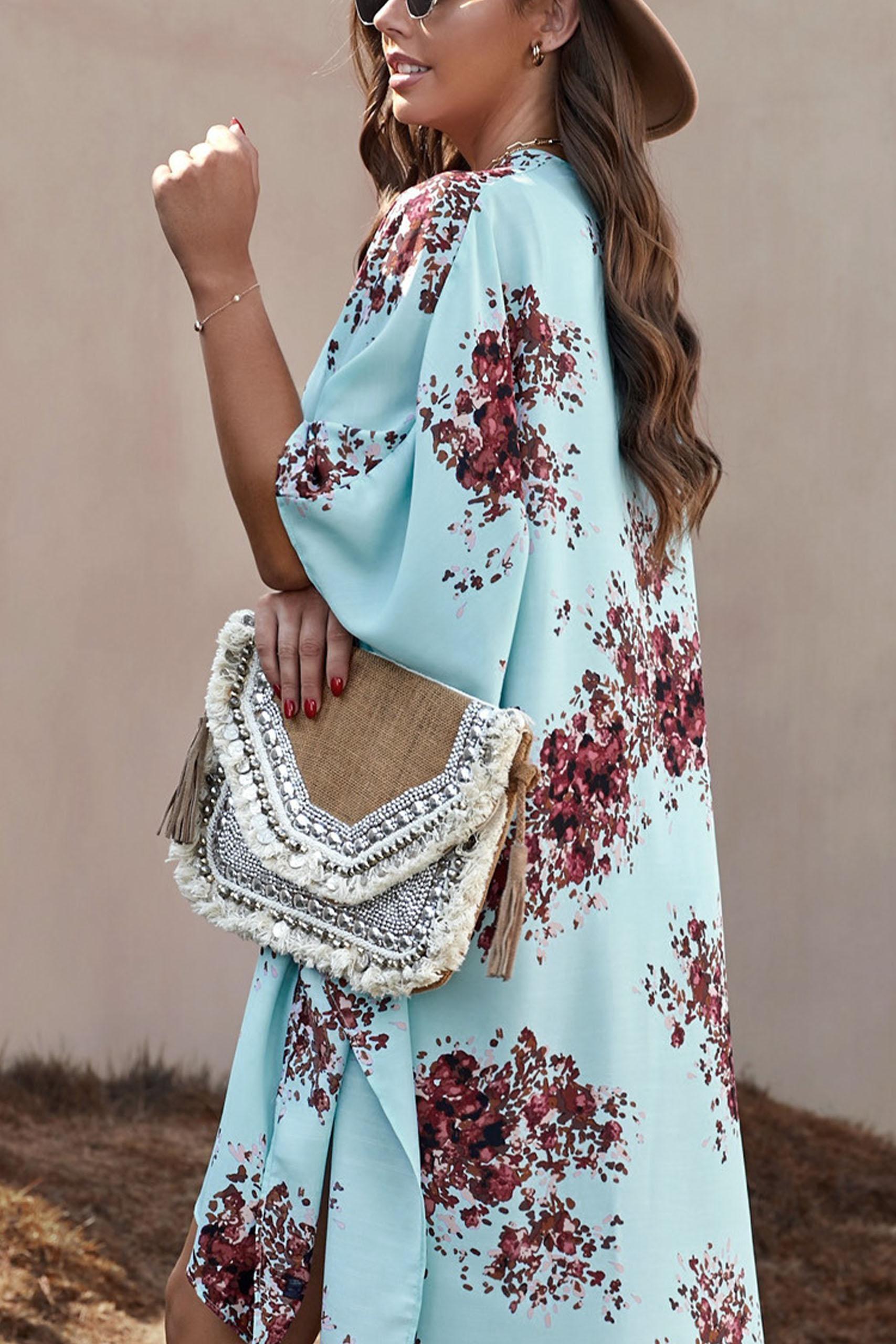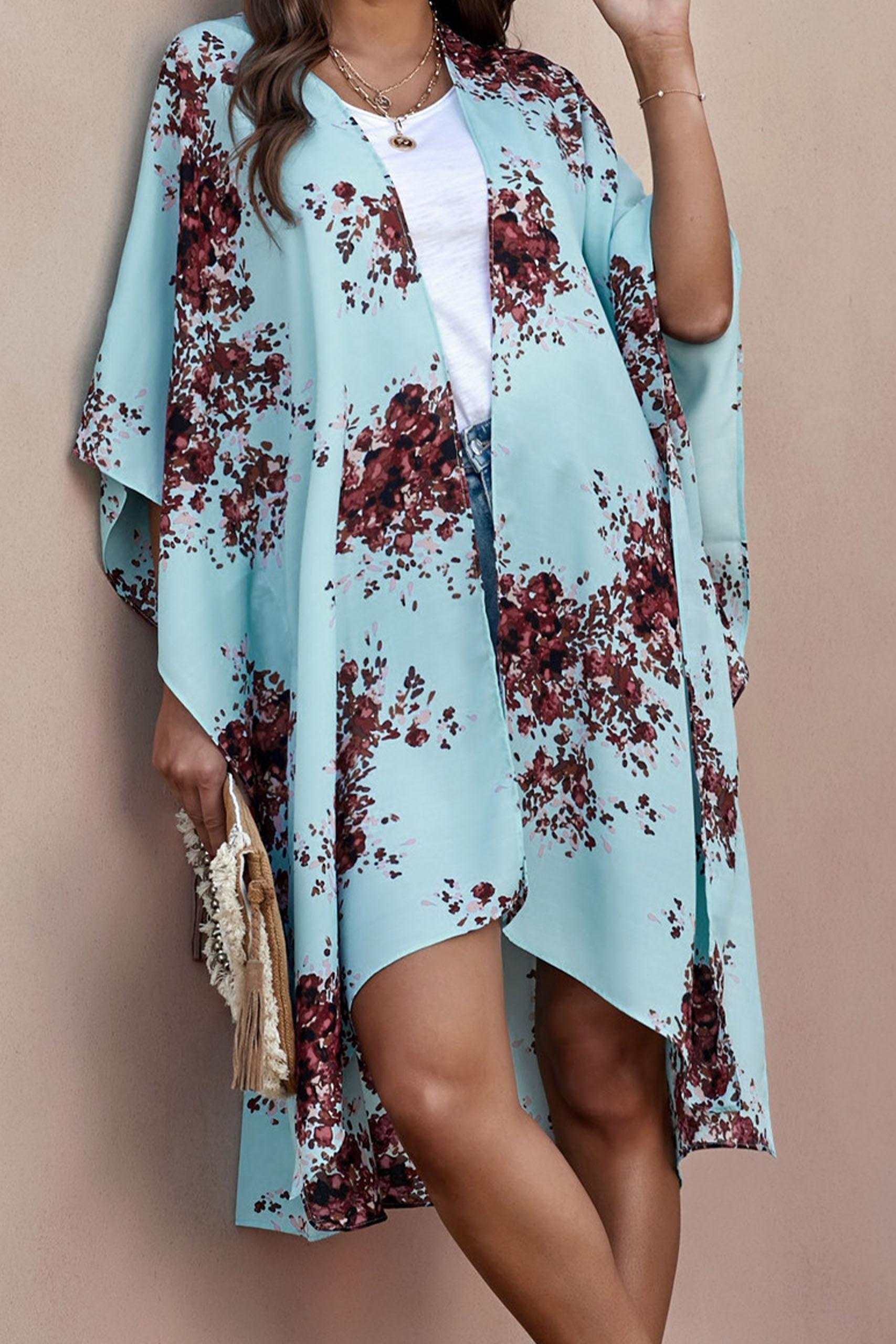 Floral loose ανοιχτό κιμονό σε γαλάζια απόχρωση με πολύχρωμες λεπτομέρειες.