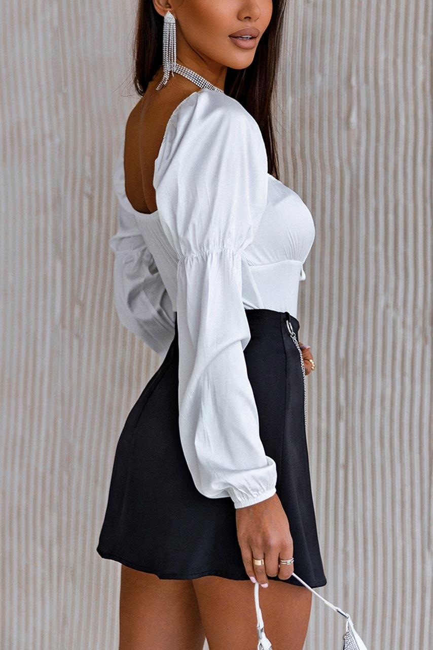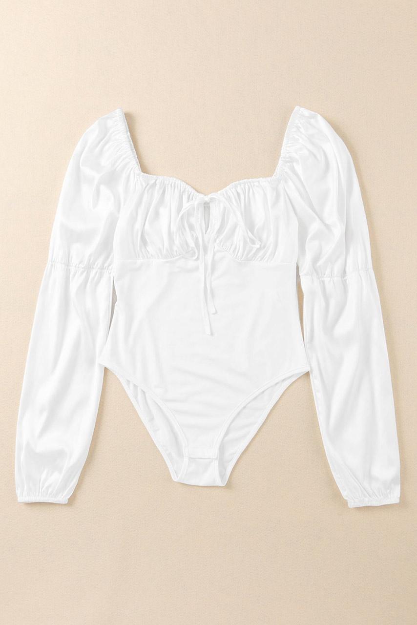 French-style ρομαντικό μποντισουίτ με balloon μανίκια και τετράγωνη λαιμόκοψη σε trendy total white απόχρωση. Είναι έτοιμο να σε συνοδεύσει στην επόμενη βραδινή σου έξοδο.
