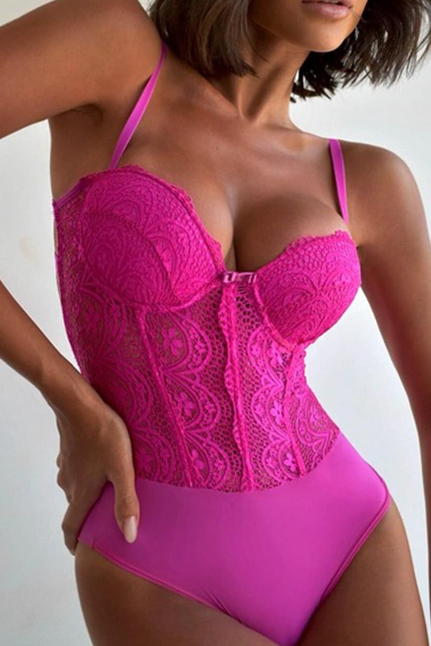 Pop glam φούξια κορμάκι με λεπτομέρειες δαντέλας all over.