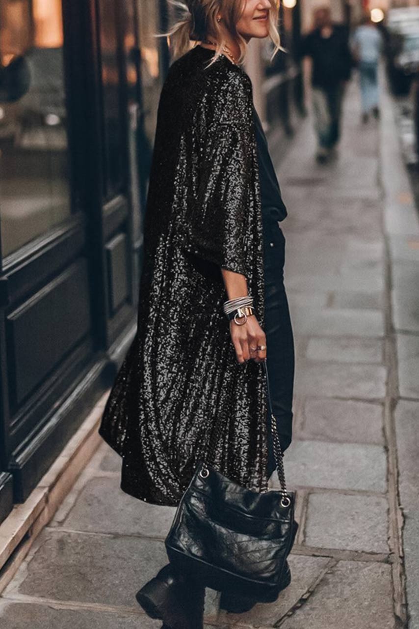 Kimono ζακέτα μακριά με παγιέτα all over.Είναι ένα λαμπερό και εντυπωσιακό κομμάτι απαραίτητο για τις γιορτές.