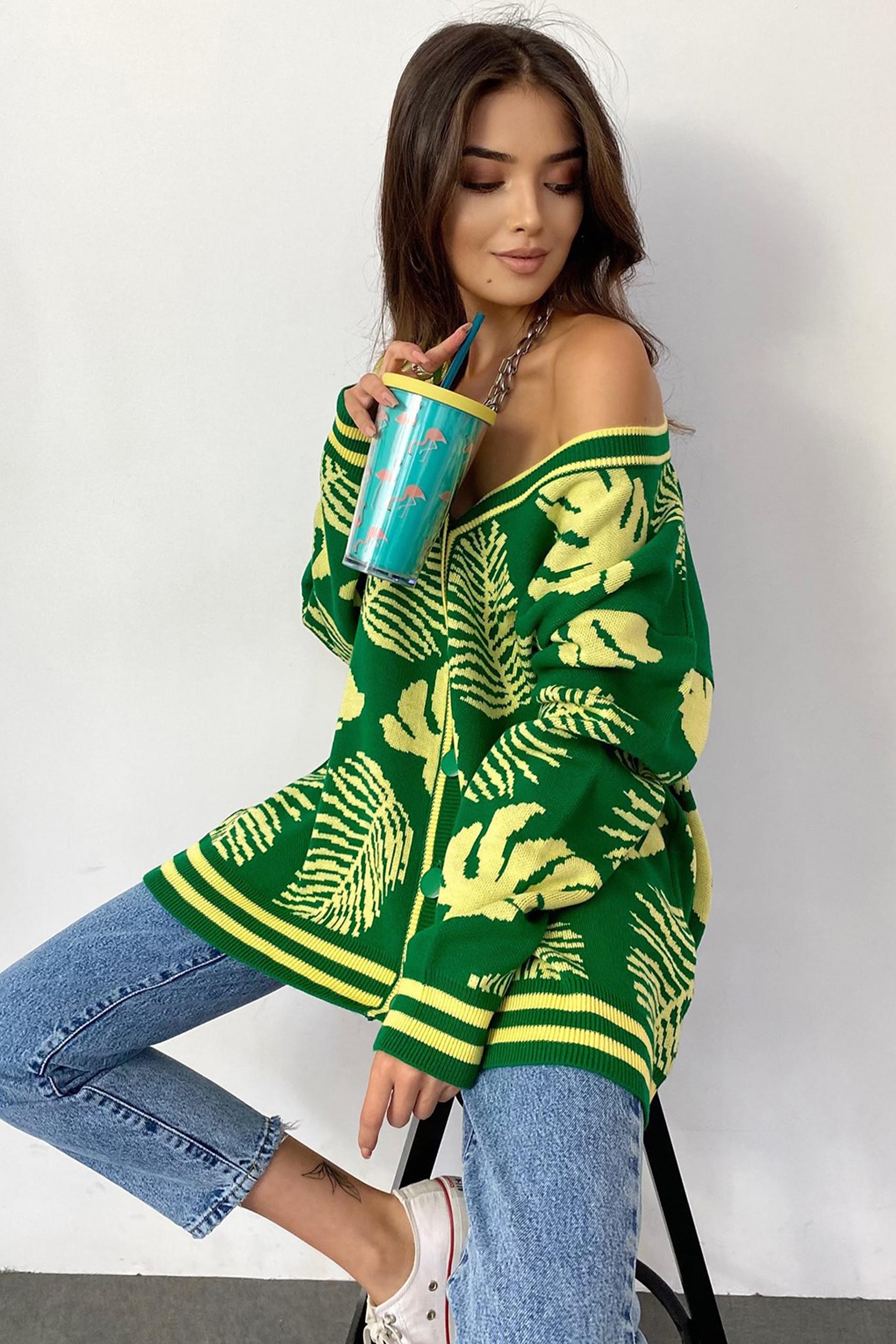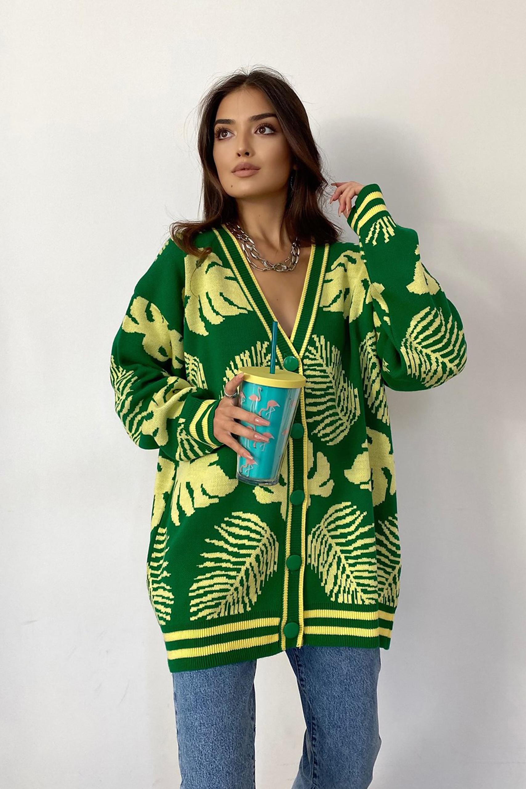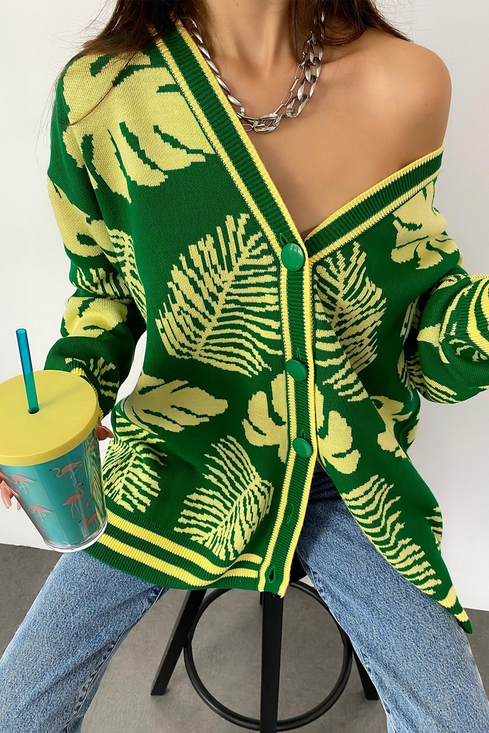 V neck loose ζακέτα με κουμπιά κατά μήκος σε έντονες neon πράσινες αποχρώσεις με τροπικό allover pattern φύλλων. Συνδυάστε το με την Leather pencil φούστα για mix n match all day outfits.