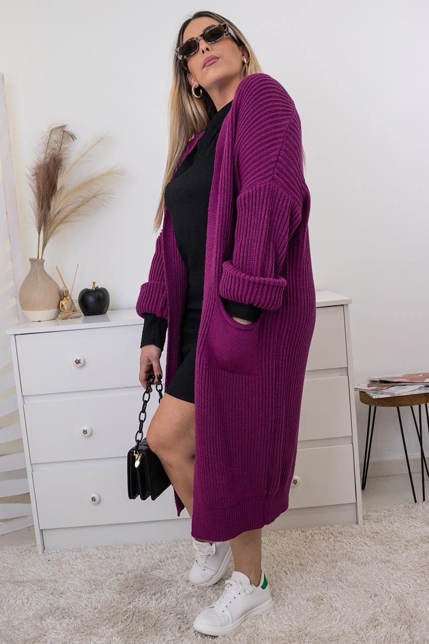 Casual longline μακρυά ζακέτα μωβ με φουσκωτά μανίκια χωρίς φερμουάρ και χωρίς κουμπιά.