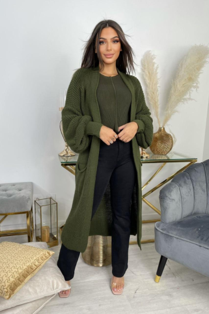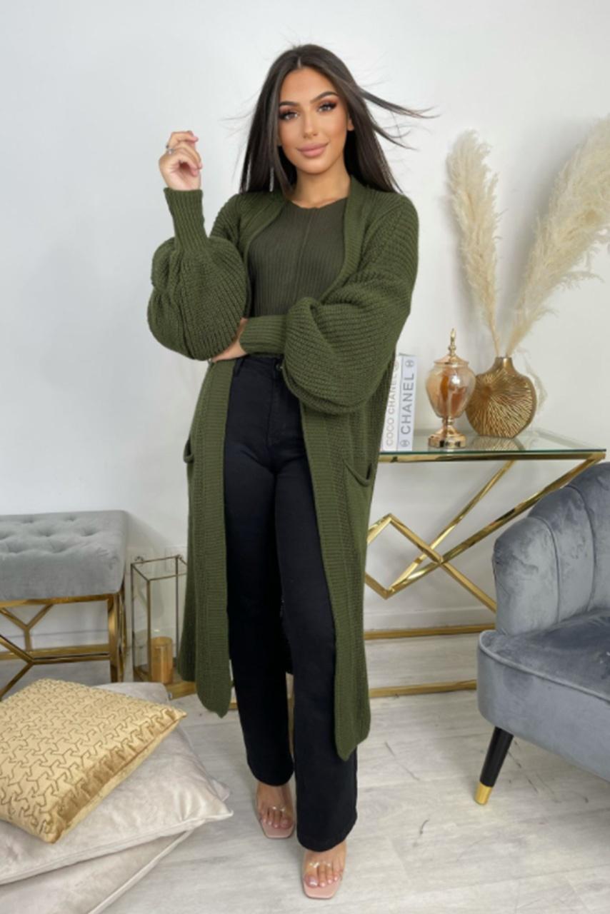 All day longline ζακέτα σε χακί με balloon μανίκια και λάστιχο στο τελείωμα τους.
