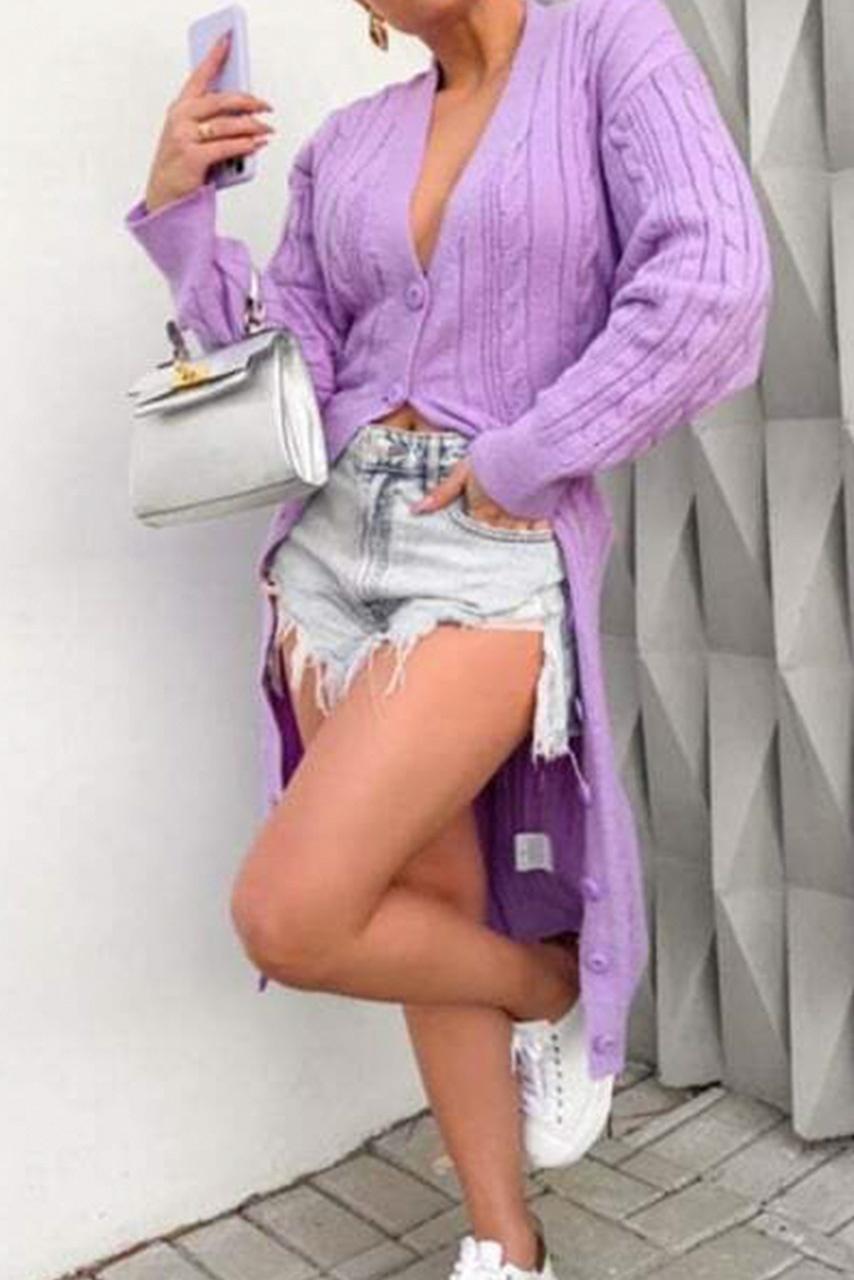 Μακριά longline πλεκτή ζακέτα με κουμπιά και V σε απαλή μωβ-λιλά απόχρωση.