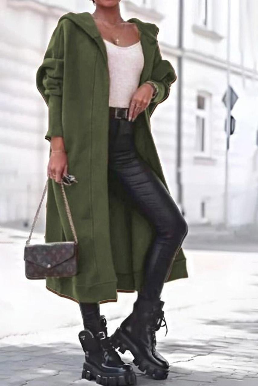 Μακριά χακί oversize φούτερ ζακέτα με κουκούλα. Θα ολοκληρώσει απόλυτα το στυλ σου συνδυάζοντας την τέλεια με τζιν, δερμάτινο παντελόνι, κολάν ακόμη και με μίνι φούστα και ψηλές μπότες.