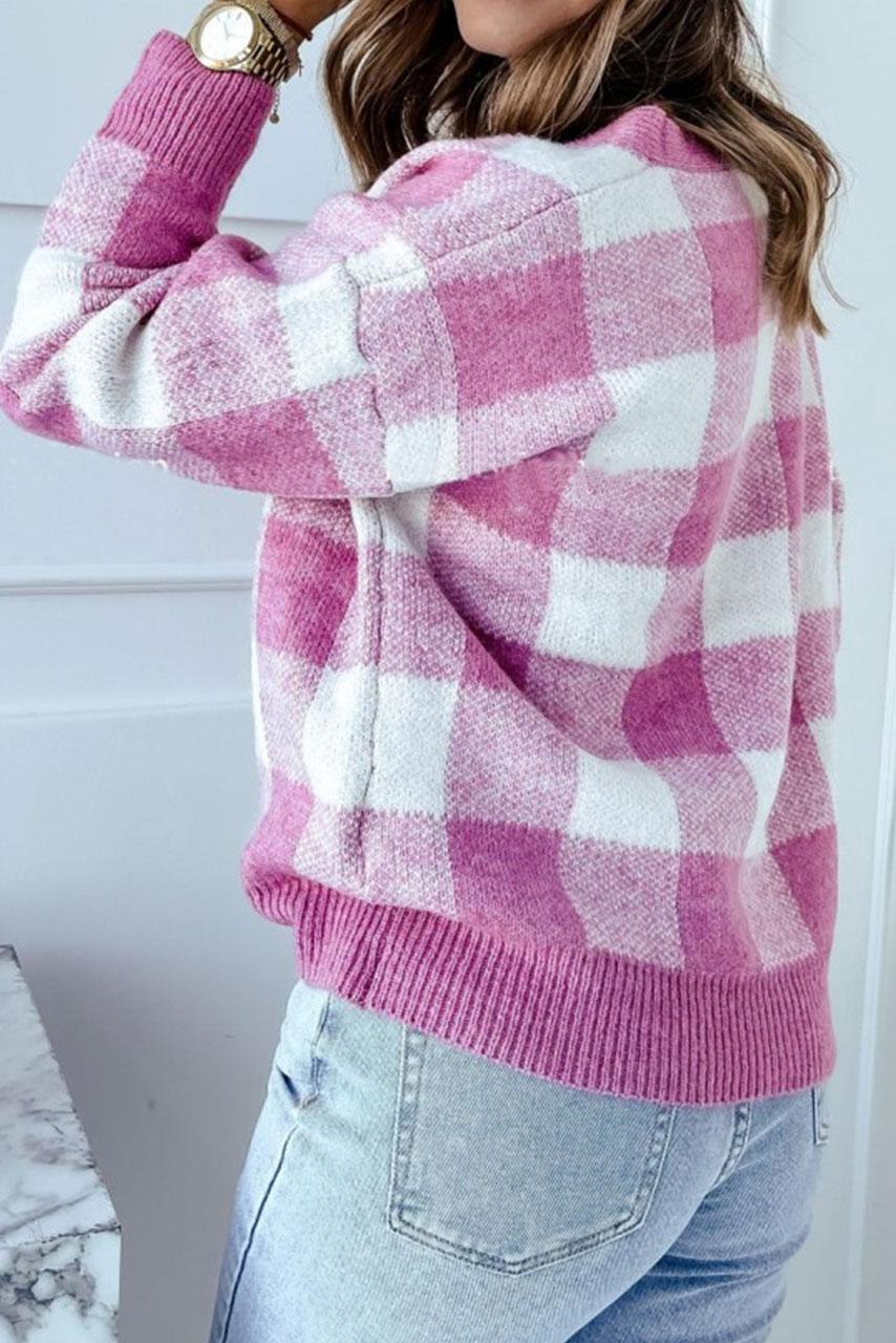 Pop girly καρώ ζακέτα μακρυμάνικη σε ροζ απόχρωση με καρώ λευκά.