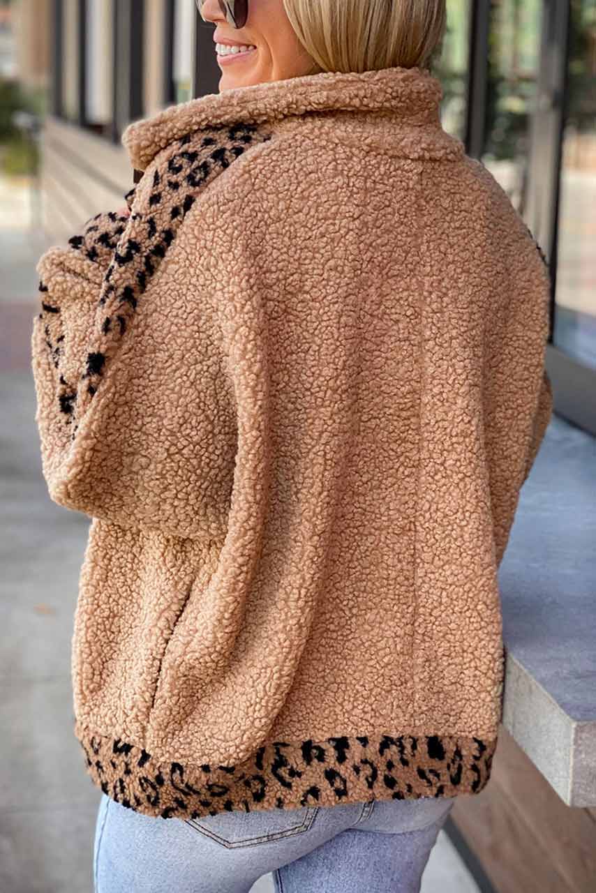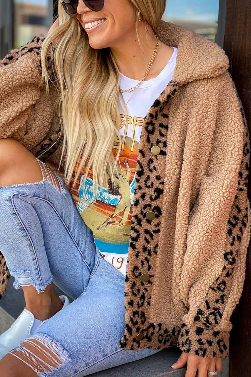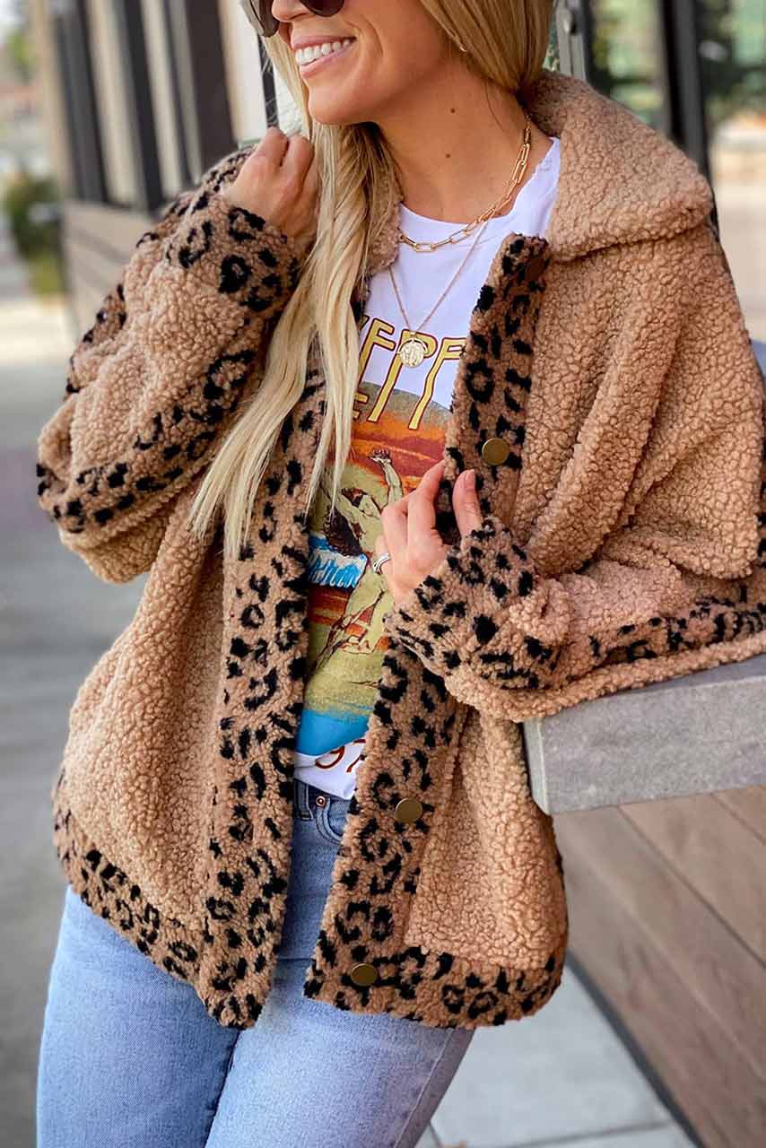 Κοντό παλτό προβατάκι με κουμπάκια για τις κρύες μέρες του χειμώνα με leopard λεπτομέρειες και τσέπες.
