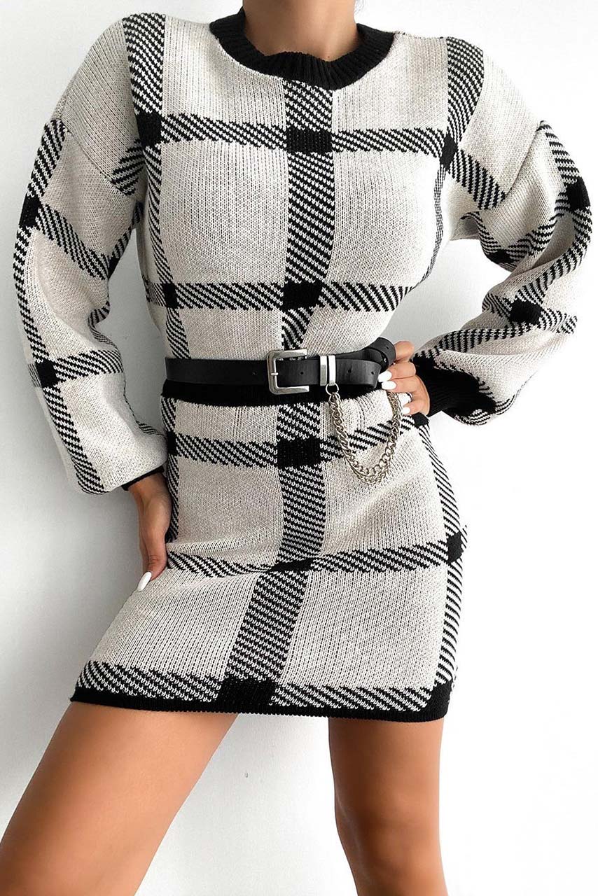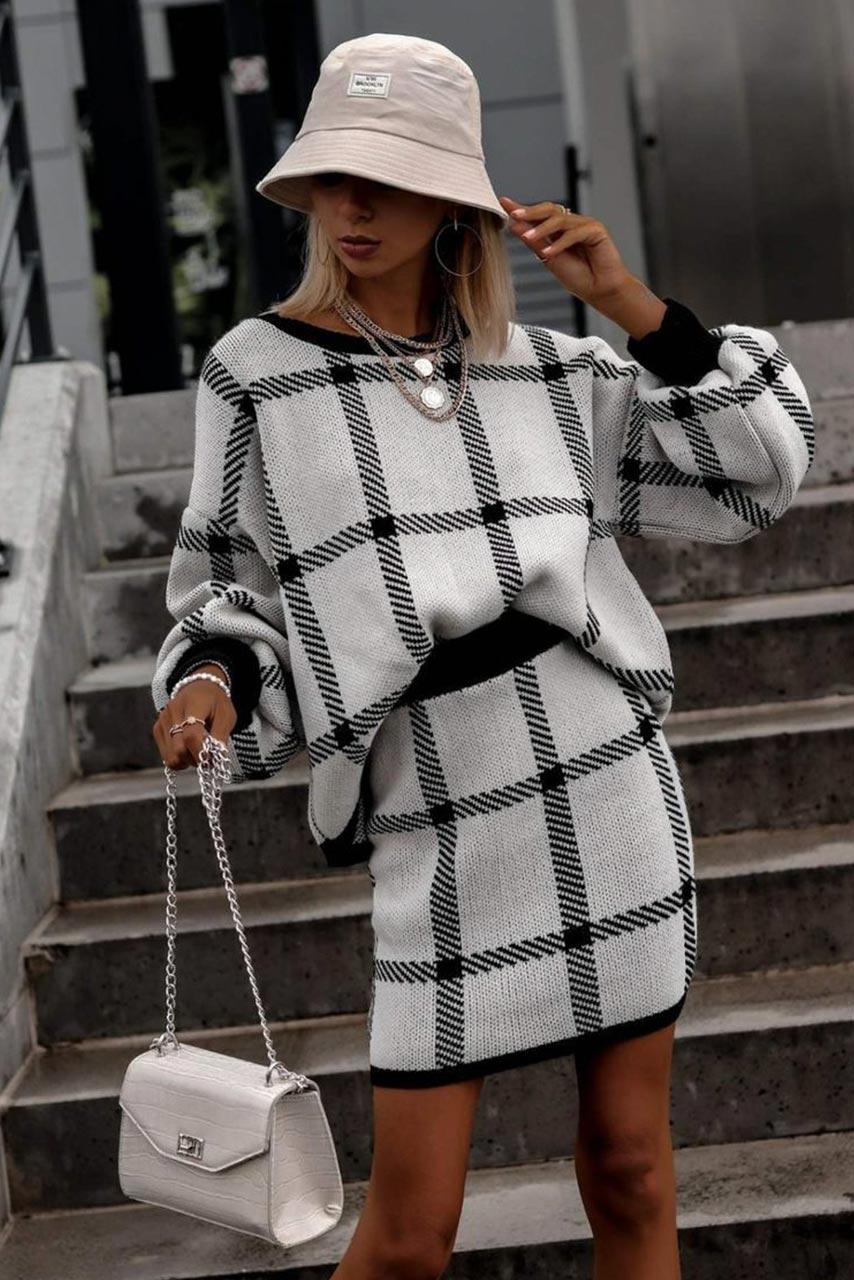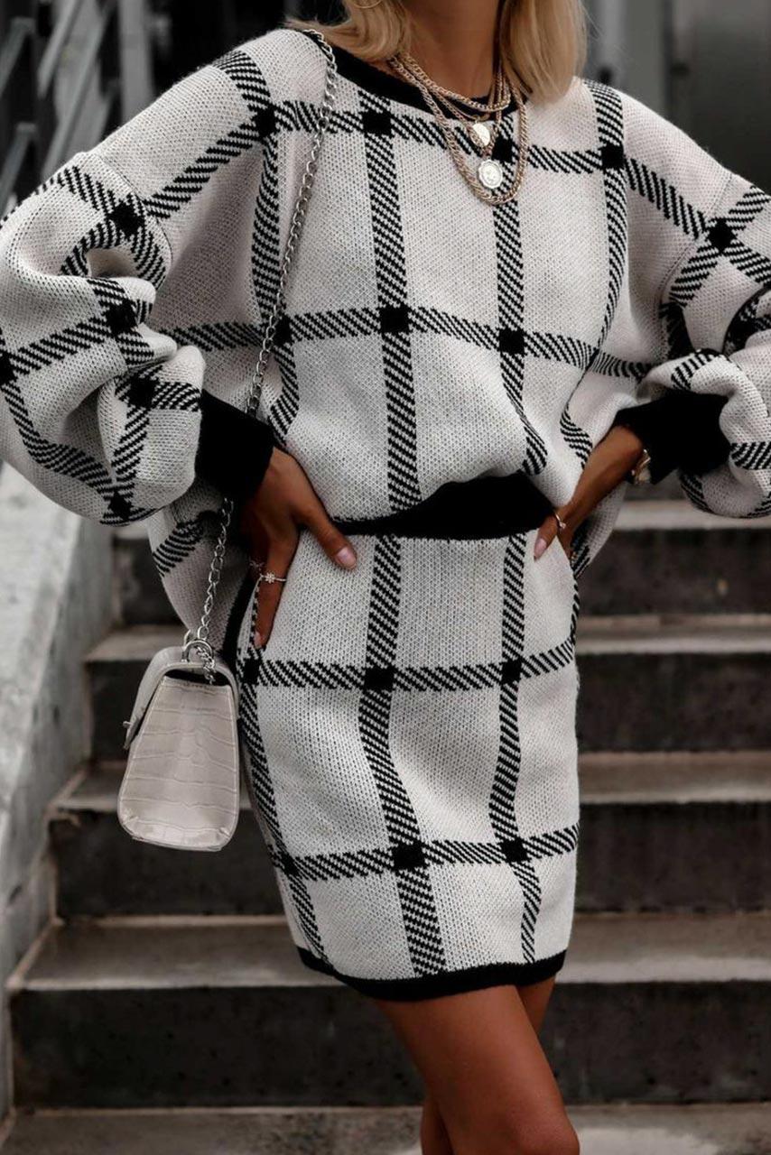 Casual καρώ σετ σε μπεζ χρώμα με O neck μακρυμάνικο τοπ και μίνι φούστα με λάστιχο στη μέση.