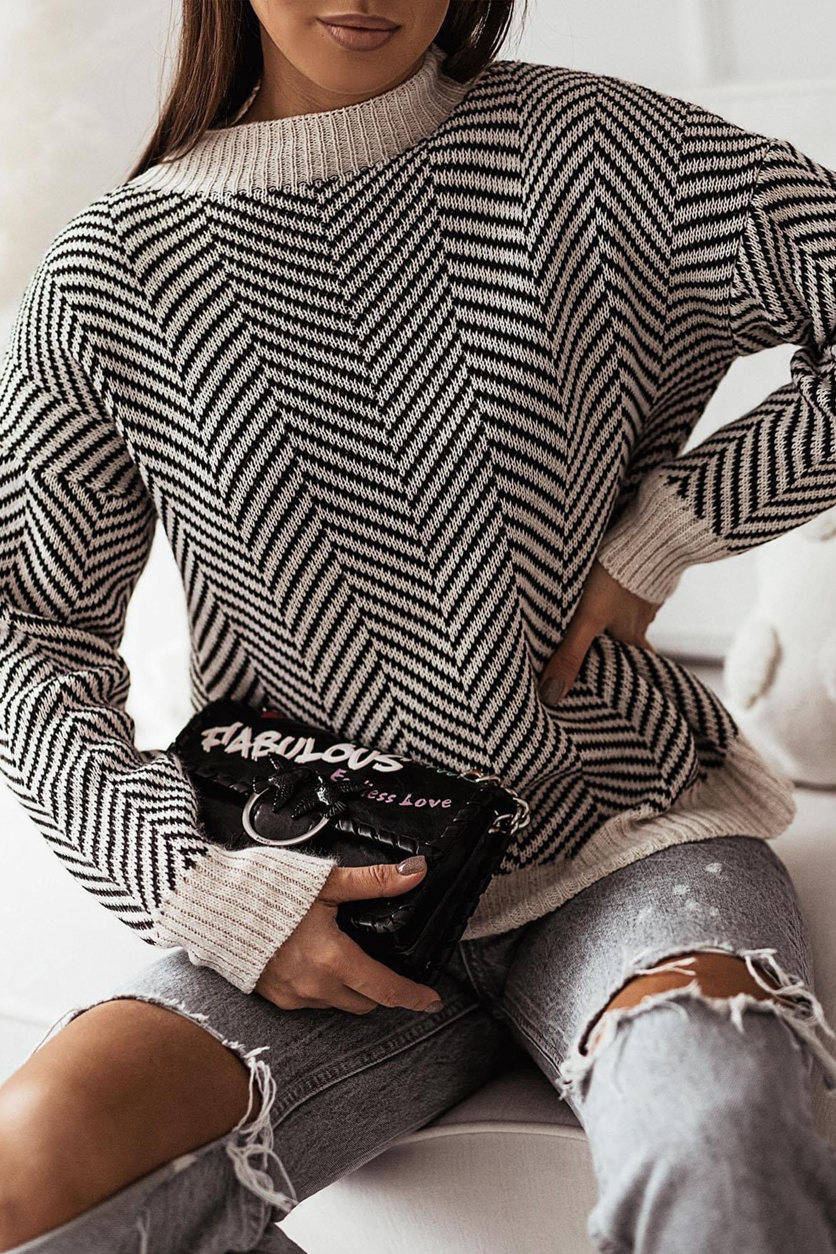 O neck herringbone sweater πουλόβερ σε ψαροκόκκαλο pattern με στρογγυλή λαιμόκοψη σε ασπρόμαυρη απόχρωση.