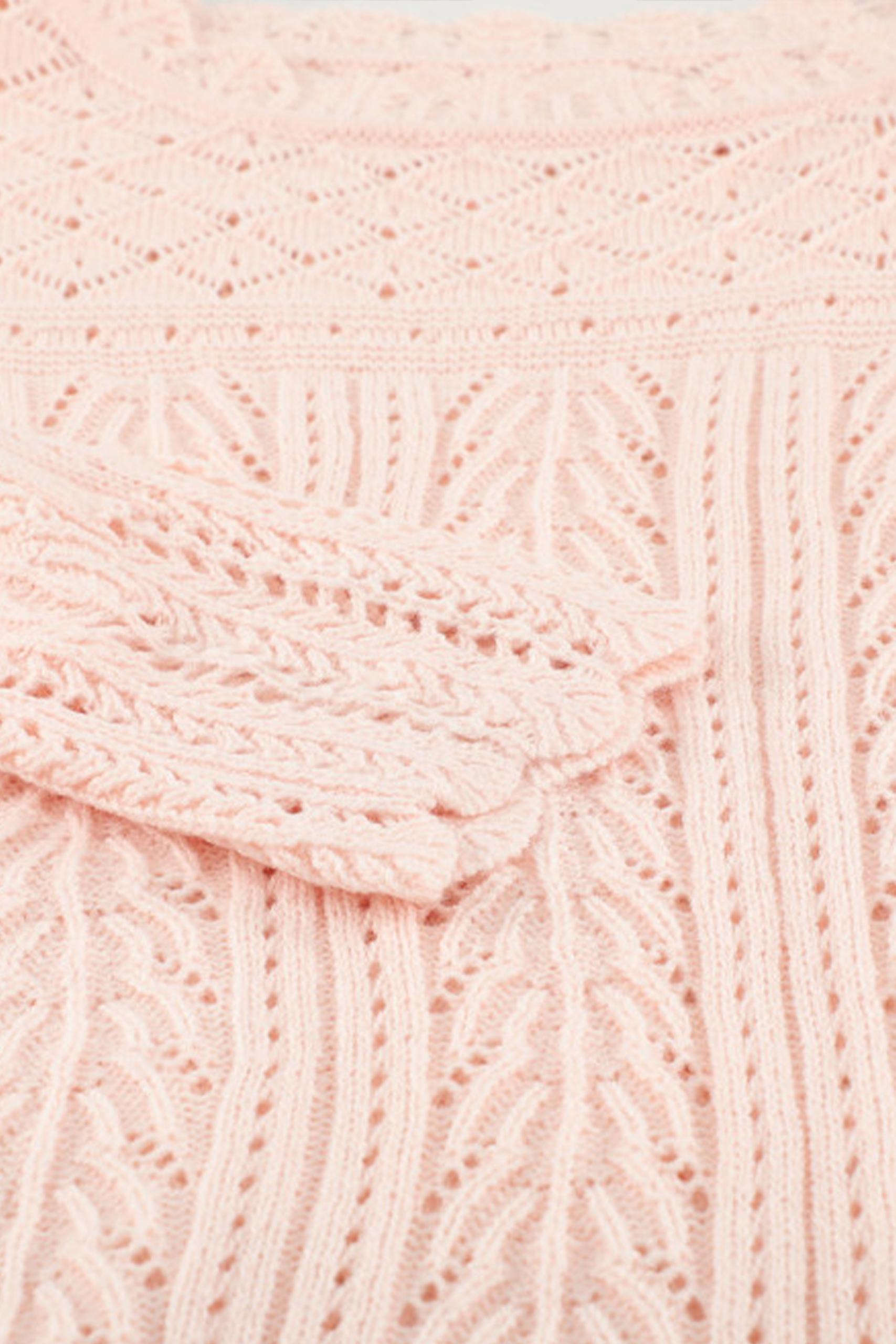 Πλεκτό διάτρητο μακρυμάνικο πουλόβερ O neck σε σομόν απόχρωση με λεπτή πλέξη.