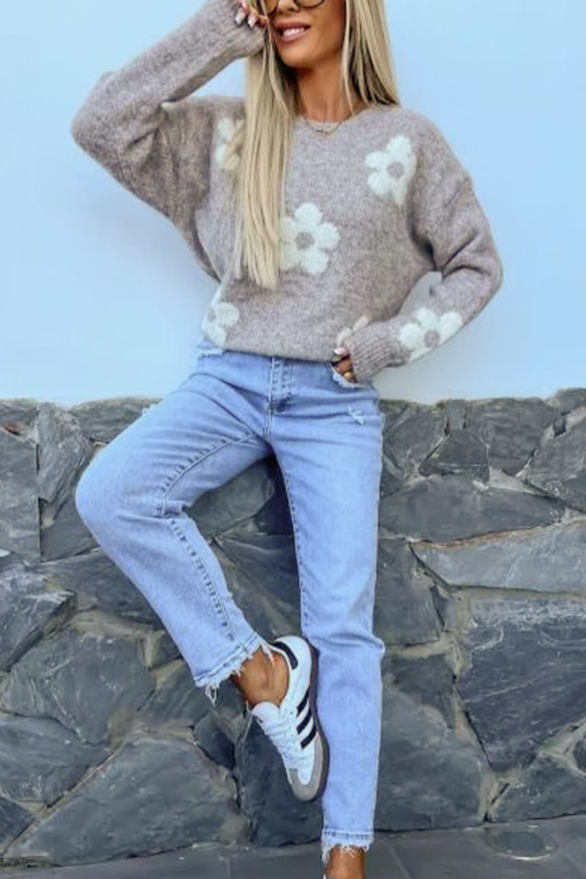 Πλεκτό γκρι μακρυμάνικο μπλουζάκι με all over λουλούδια και στρογγυλή λαιμόκοψη.