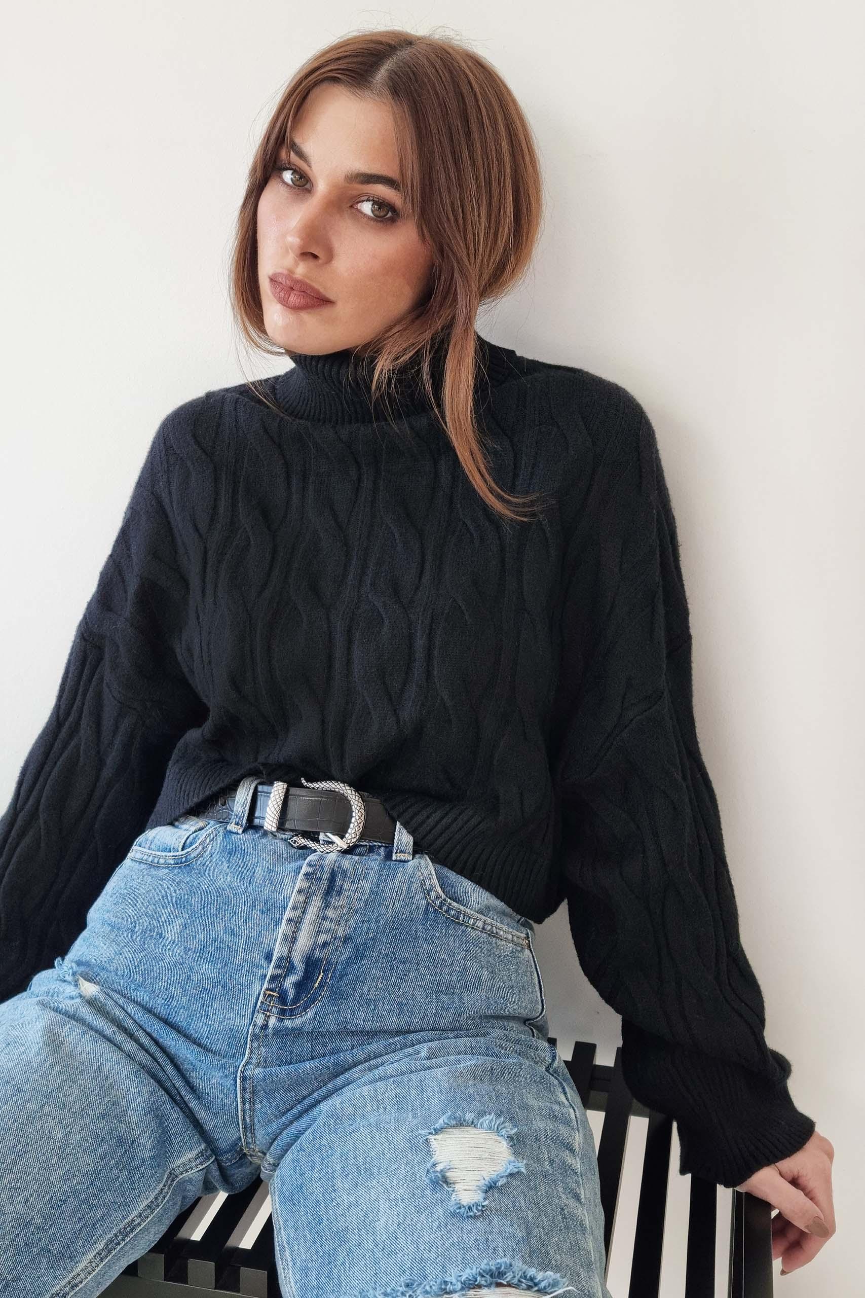Turtleneck crop braided πουλόβερ μακρυμάνικο με μεγάλο ζιβάγκο σε τρεις γήινες αποχρώσεις.