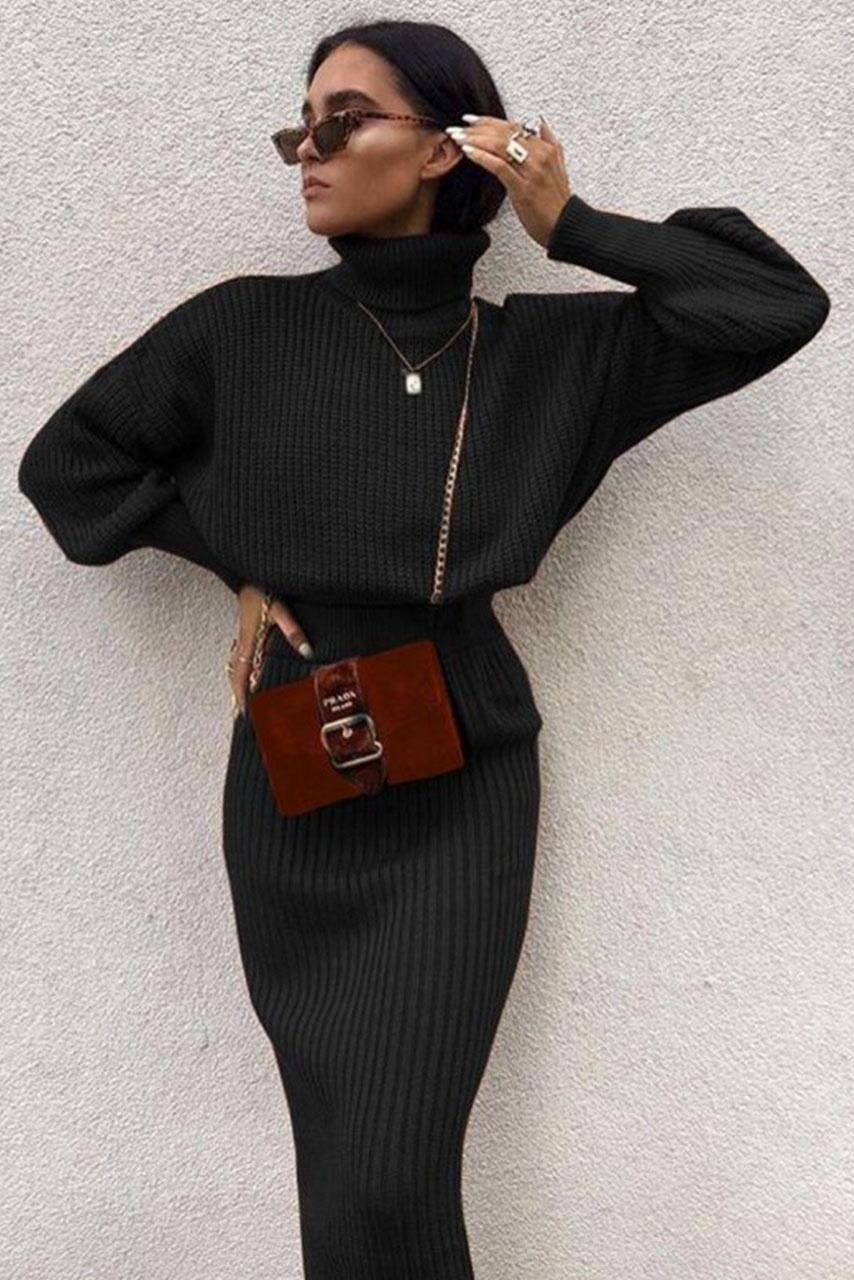 Turtleneck μάλλινο ζιβάγκο πουλόβερ σε μαύρη αποχρώση και φούστα με λάστιχο στη μέση και σκίσιμο.
