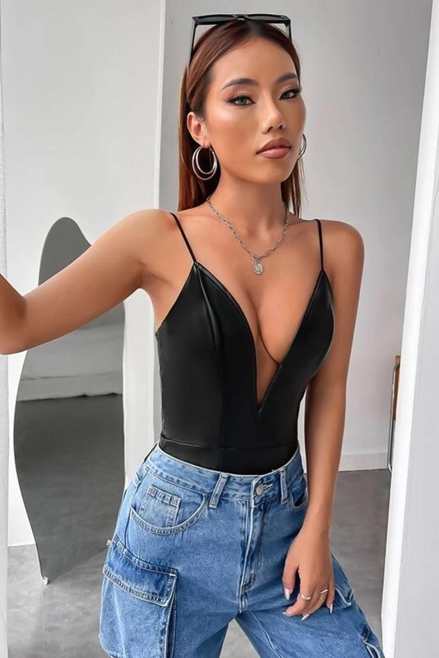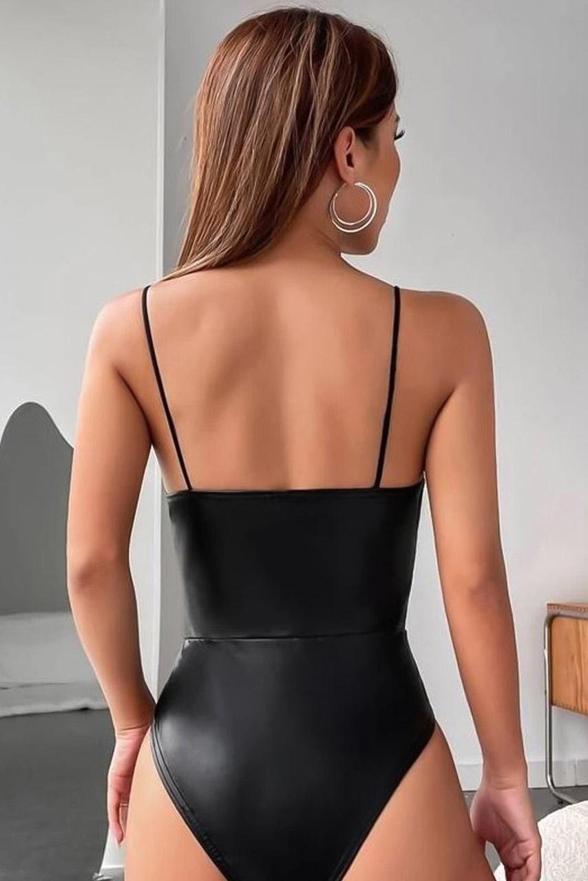 Δερμάτινο open V neck κορμάκι μαύρο