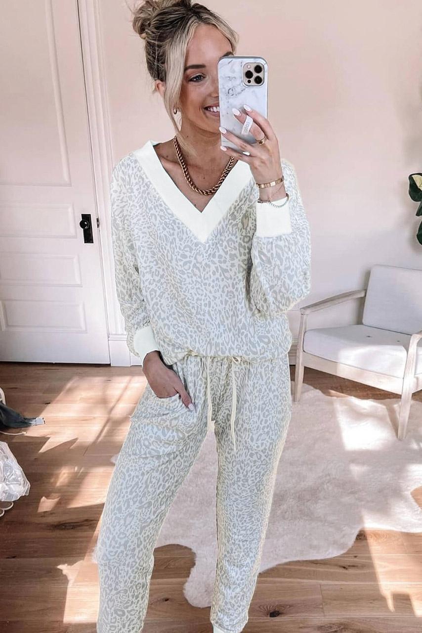 Cozy leopard loungewear σετ με V neck top και παντελόνι με λάστιχο στη μέση και στο τελείωμα.