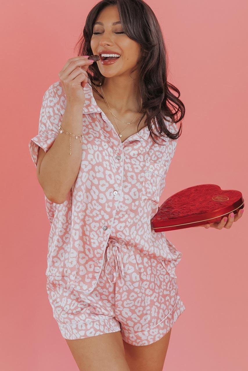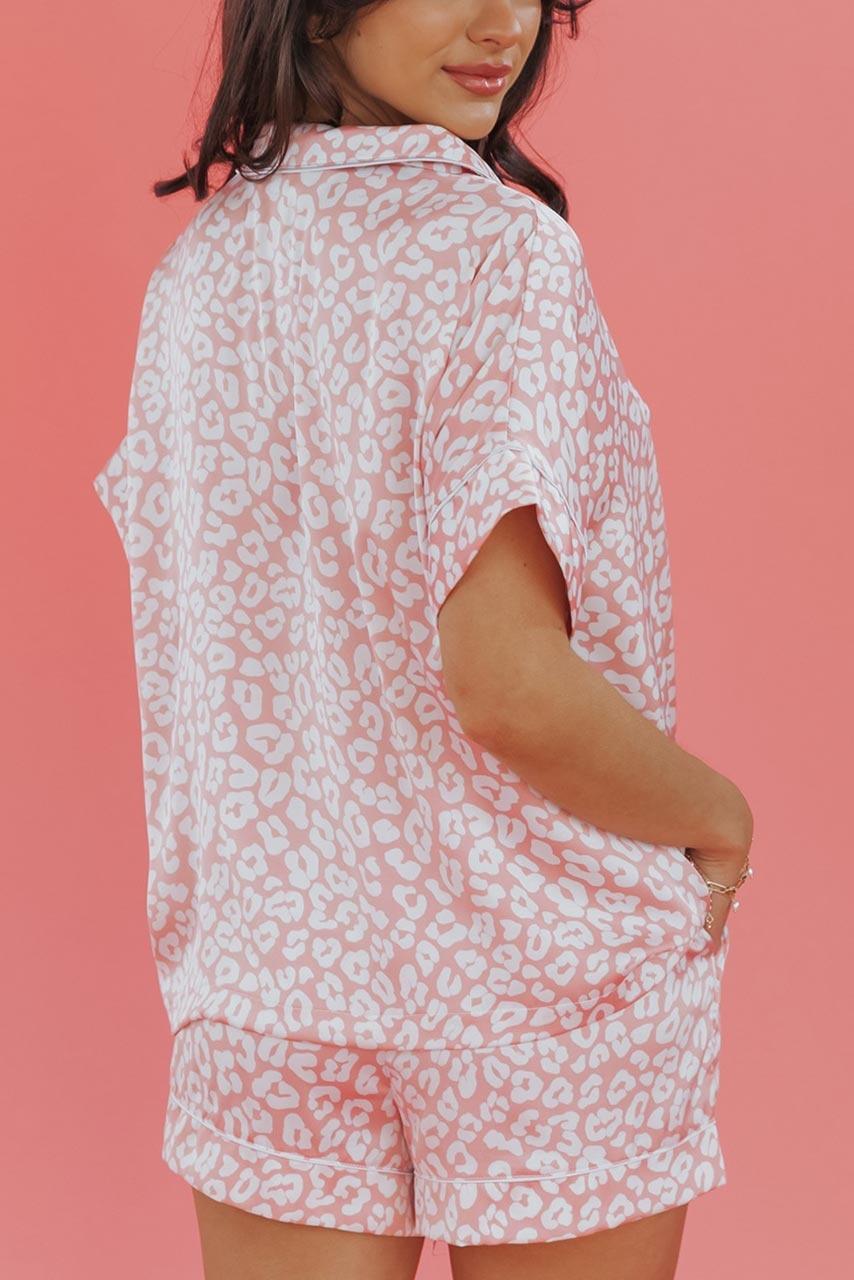 Pink leopard σατέν σετ loungewear πυτζάμες με κοντομάνικο πουκάμισο και ασορτί σορτς με τσέπες, για cozy all day total girly εμφανίσεις.