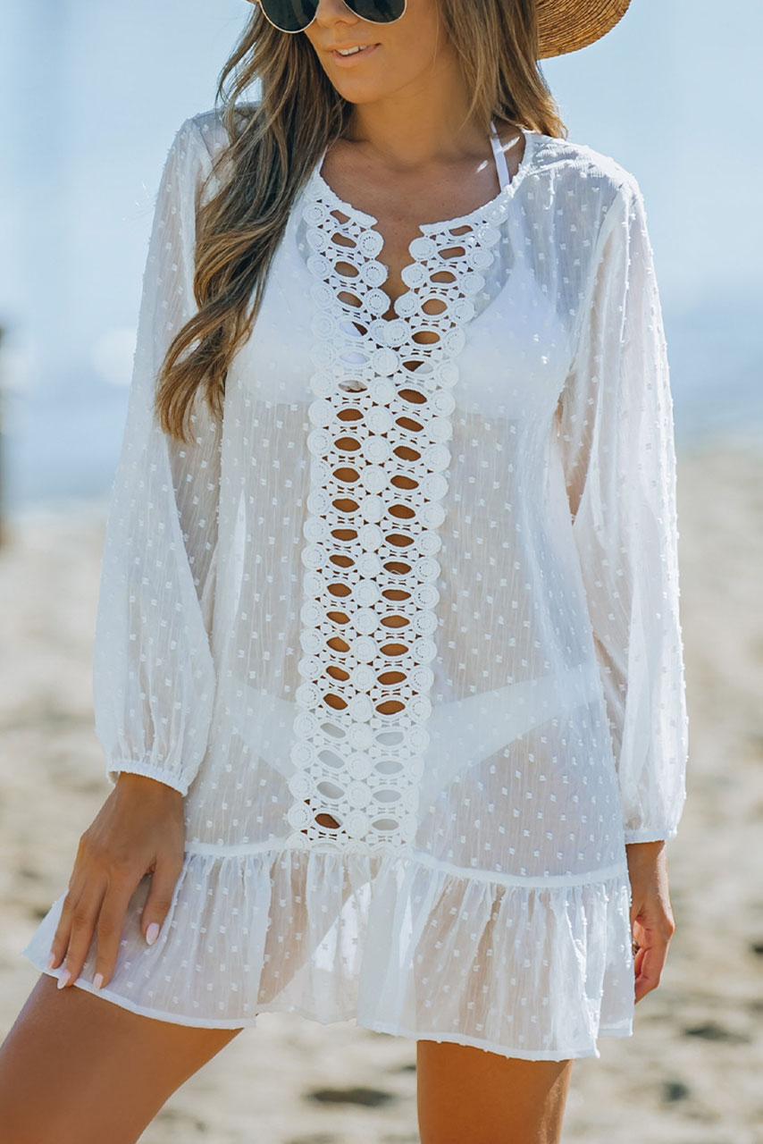 Romantic beachwear μίνι φόρεμα παραλίας σε λευκό χρώμα με πουά all pattern και μικρές διάτρητες λεπτομέρειες.