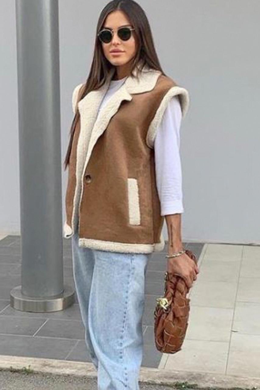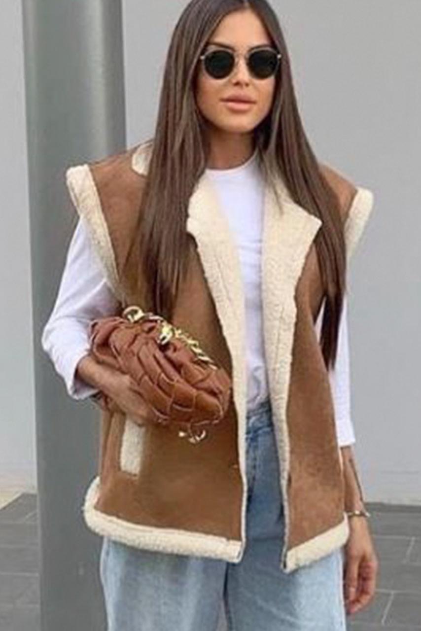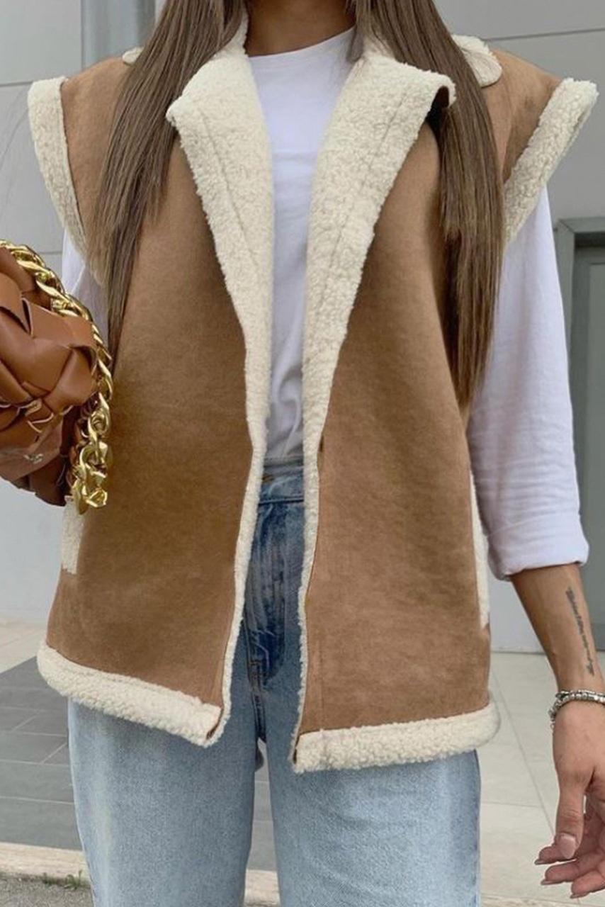 Γιλέκο oversized με γουνίτσα sherpa σε κάμελ απόχρωση, για casual ζεστές εμφανίσεις.