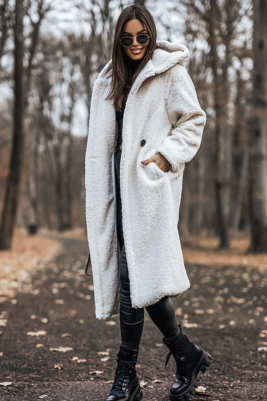 Cozy glam baige παλτό midi με κουκούλα σε λευκή απόχρωση.