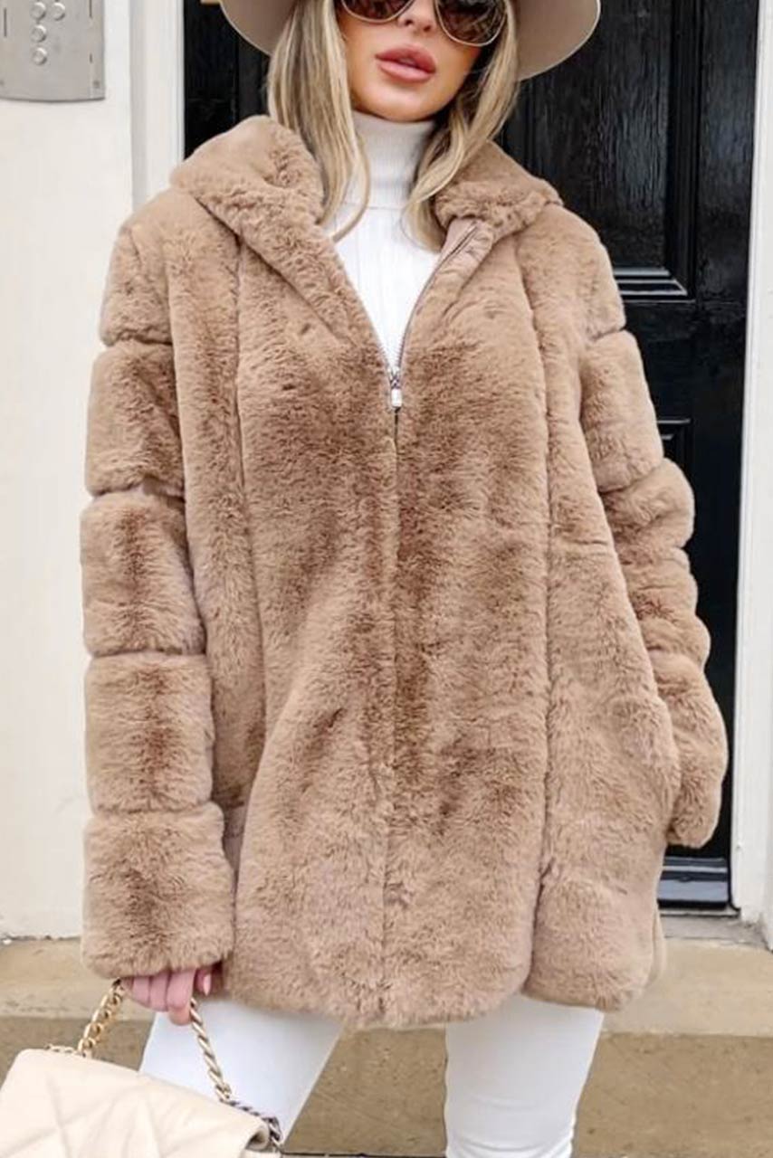 Glam rock oversized γούνα με κουκούλα σε μπεζ απόχρωση με φερμουάρ κατά μήκος.