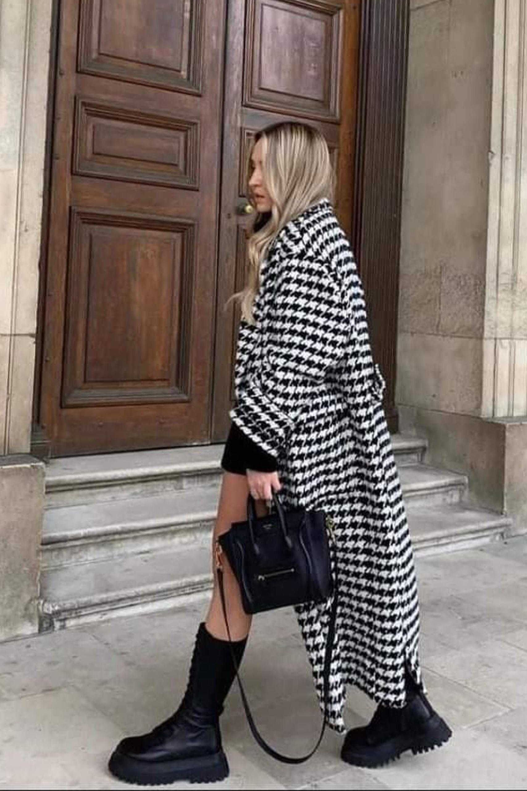 Houndstooth longline loose πανωφόρι ασπρόμαυρο με μεγάλο γιακά και φαρδυά μανίκια.