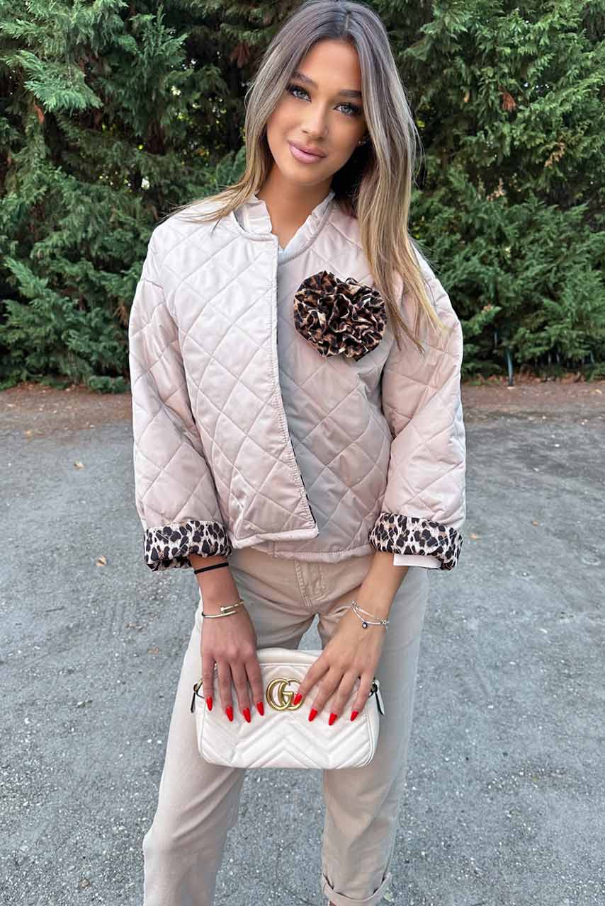Μπουφάν καπιτονέ φθινοπωρινό λευκό με leopard λεπτομέρεια και λουλούδι