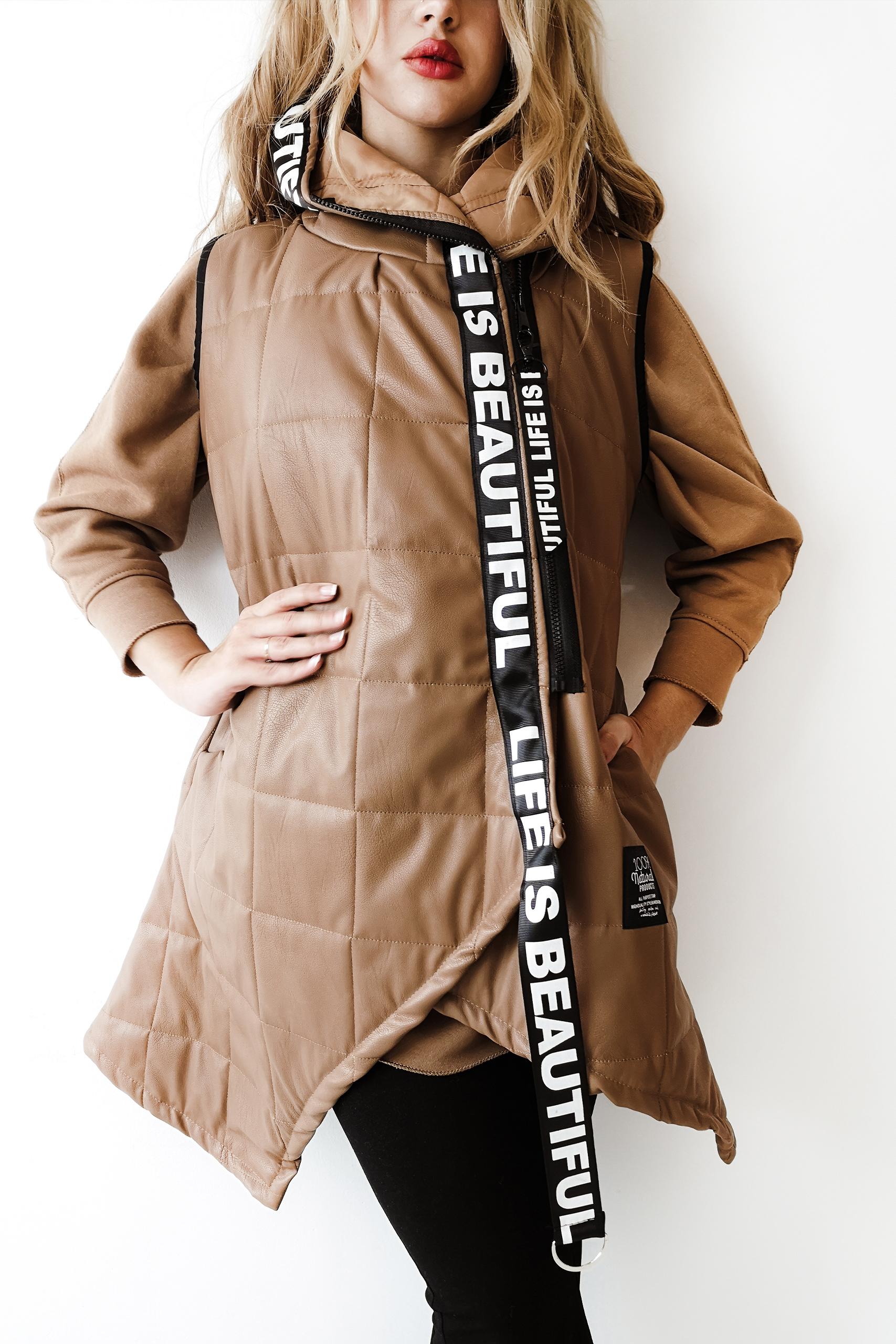 Quilted leather καπιτονέ ασύμμετρο αμάνικο parka με κουκούλα σε απαλή καφέ απόχρωση.