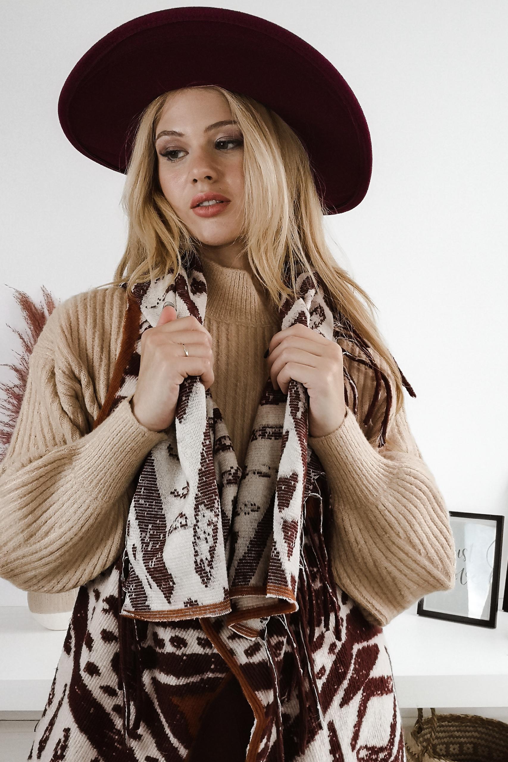 Boho chic tribal printed αμάνικο πλεκτό με ανοιχτά κρόσσια στο τελείωμα και fluffy γιακά on top.