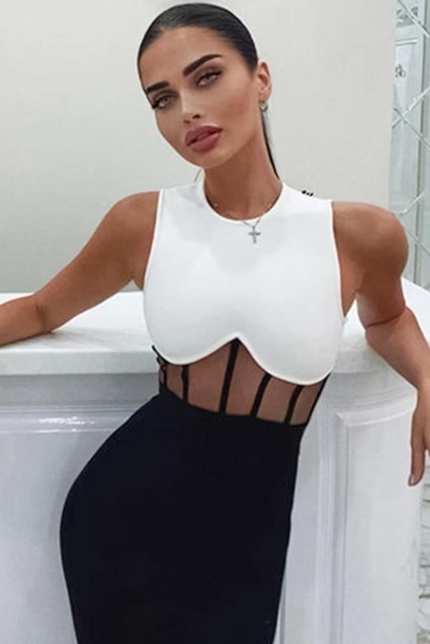 Elegant ολόσωμη ασπρόμαυρη φόρμα με λεπτομέρειες διαφάνειας για μοναδικές εμφανίσεις.