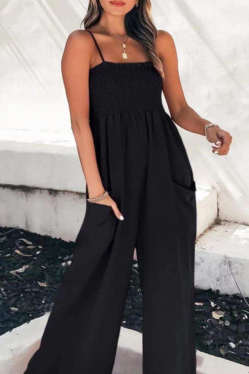 Casual all day ολόσωμη φόρμα με σφηκοφωλιά on top και πολύ λεπτές τιράντες σε μαύρο χρώμα.