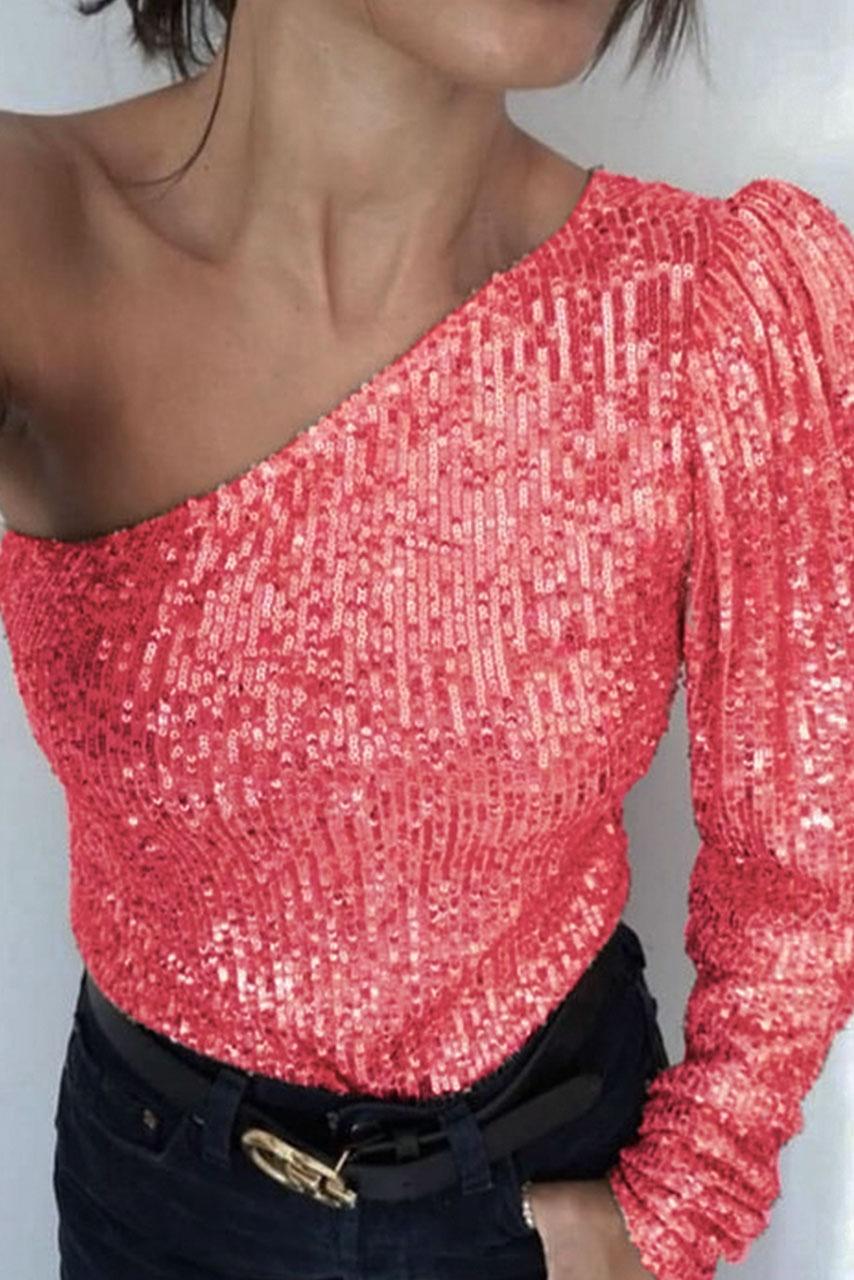 Disco glam off shoulder κορμάκι από παγιέτα σε dusty pink χρώμα.