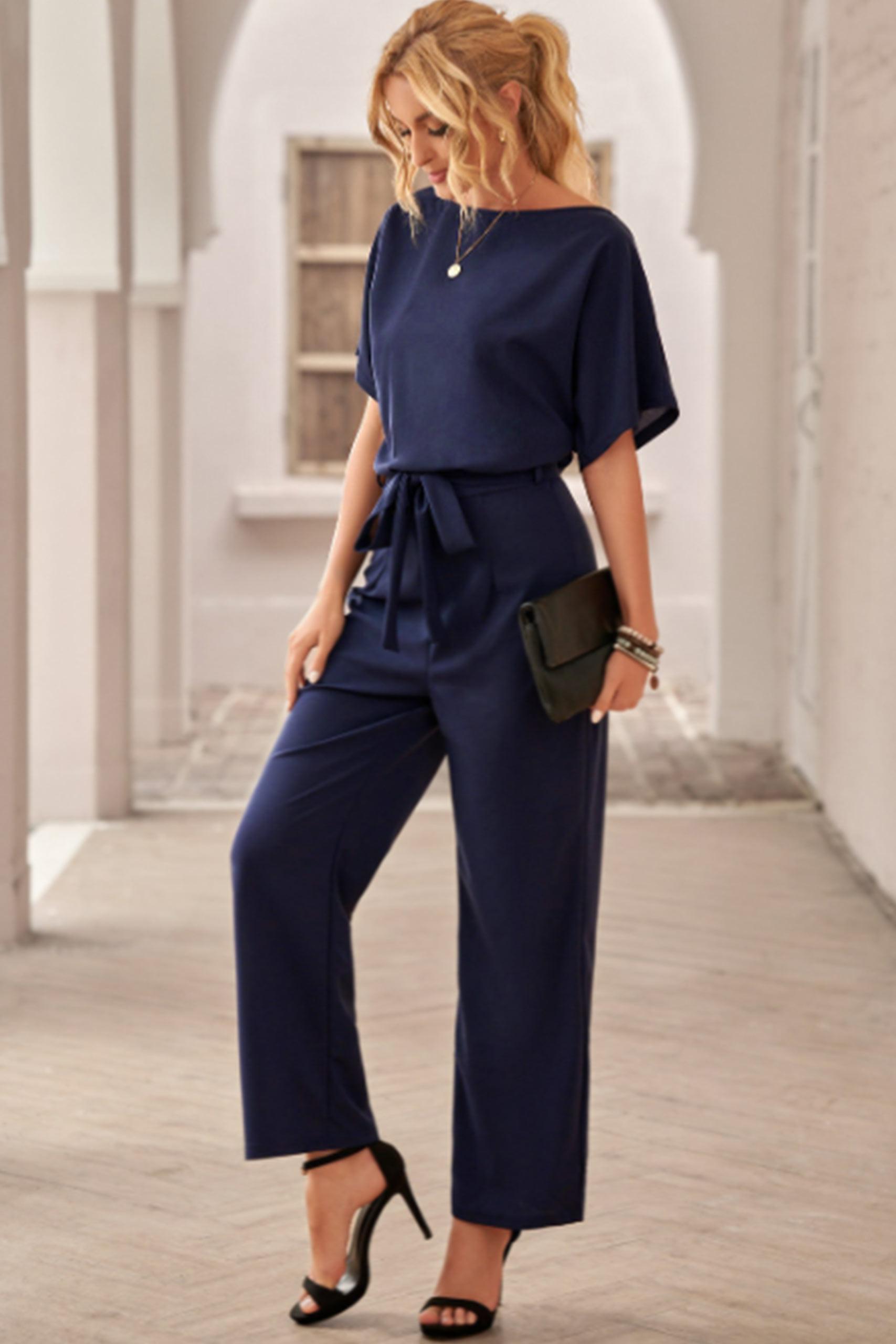 Office style κοντομάνικη ολόσωμη φόρμα με ζωνάκι ίδιου υφάσματος στη μέση σε σκούρες αποχρώσεις του μπλε και του μαύρου.